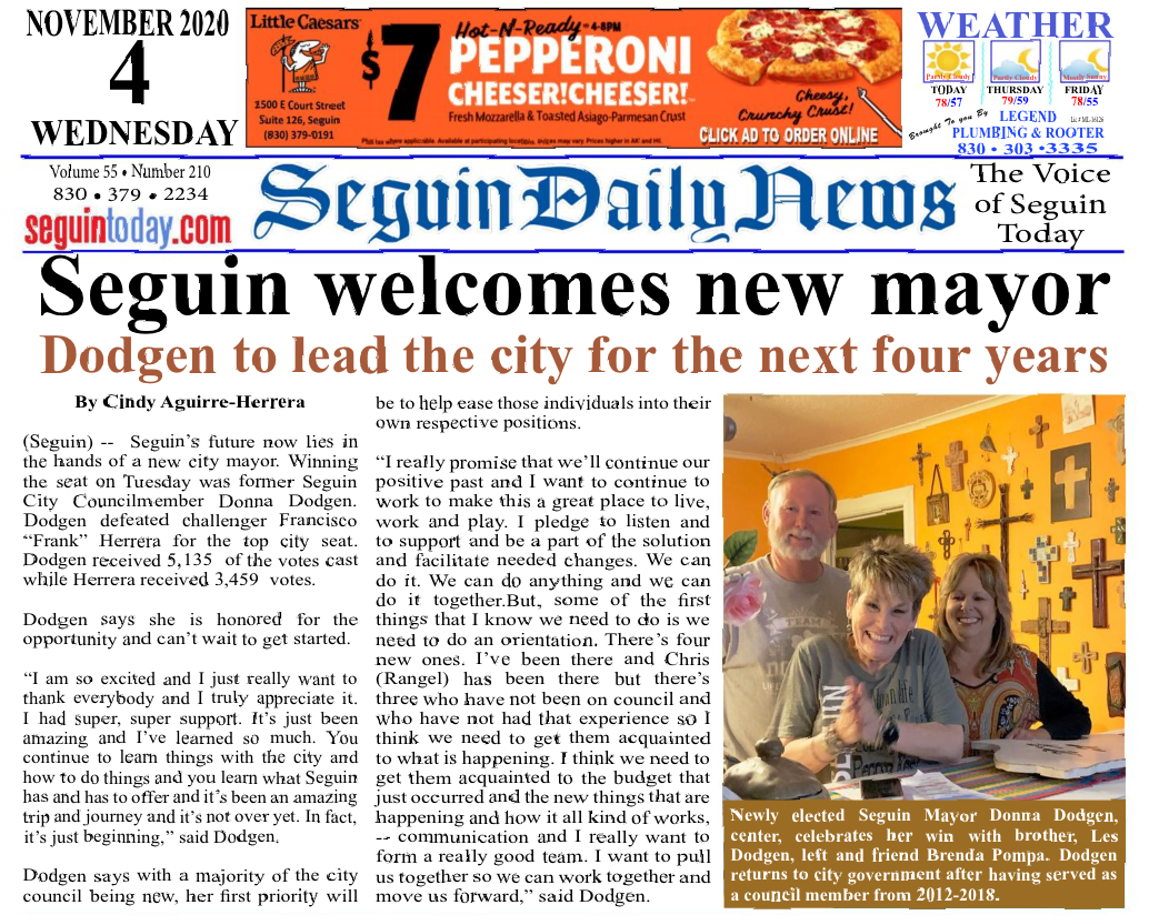 Congratulations to Emanuel's member Donna Dodgen, or should we say MAYOR Dodgen. Donna is passionate about her community and a true servant leader. Did you know, in addition to her other leadership roles at the church, she changes our paraments at the altar as the liturgical season changes? Her attention to these small, but important details will serve the City of Seguin very well. Again .. Congratulations!