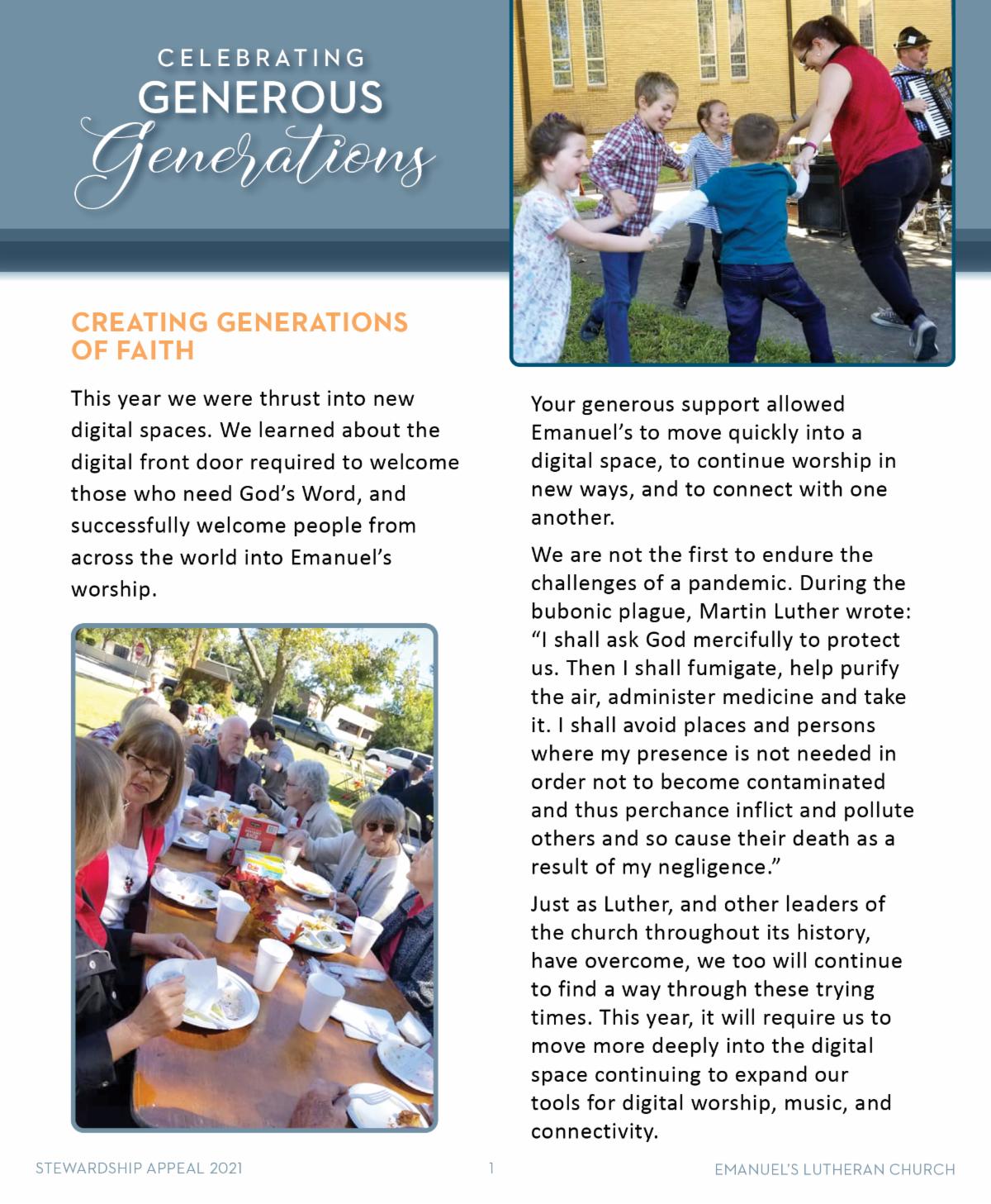 "Celebrating Generous Generations" is the theme of our 2021 stewardship appeal. Every week, you will have a chance to read about and celebrate all that we have accomplished, by the grace of God, during this 2020 year of ministry, as well as prayerfully consider all that God might be leading us to in 2021. Our goal, in 2021, is to increase our total giving by $288 per week to provide $15,000 extra toward our mission and ministry. Please reach out to our stewardship team, Susan Yeatts, Hazel Dalton, Keith Vinyard, and Donna Dodgen, if you have any questions. Thank you for all you have done and made possible in 2020!
