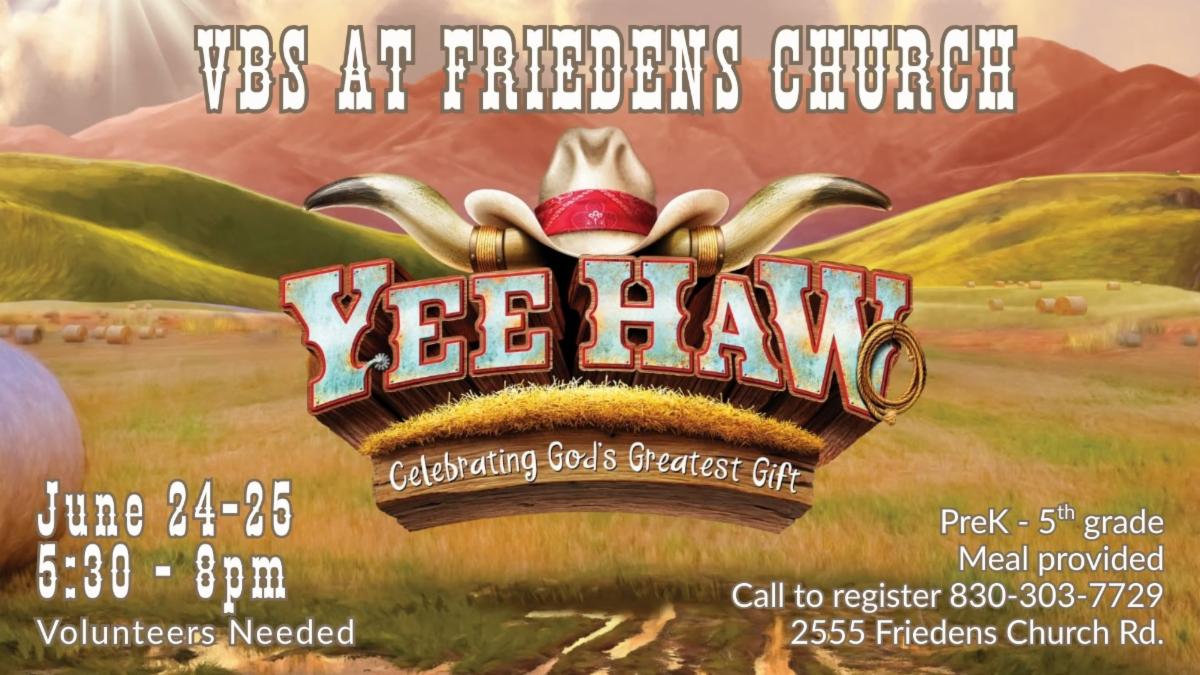 “YEE HAW! Celebrating God's Greatest Gift” VBS at Friedens Church is June 24-25 from 5:30-8:30pm for Pre-K to 5th graders. We are once again partnering with our Compass Cooperative community for another fabulous vacation bible school experience. This evening event is geared for busy families to make time for each other, a little food and games, and a whole lotta fun and Jesus! Call the church office to register your kids.