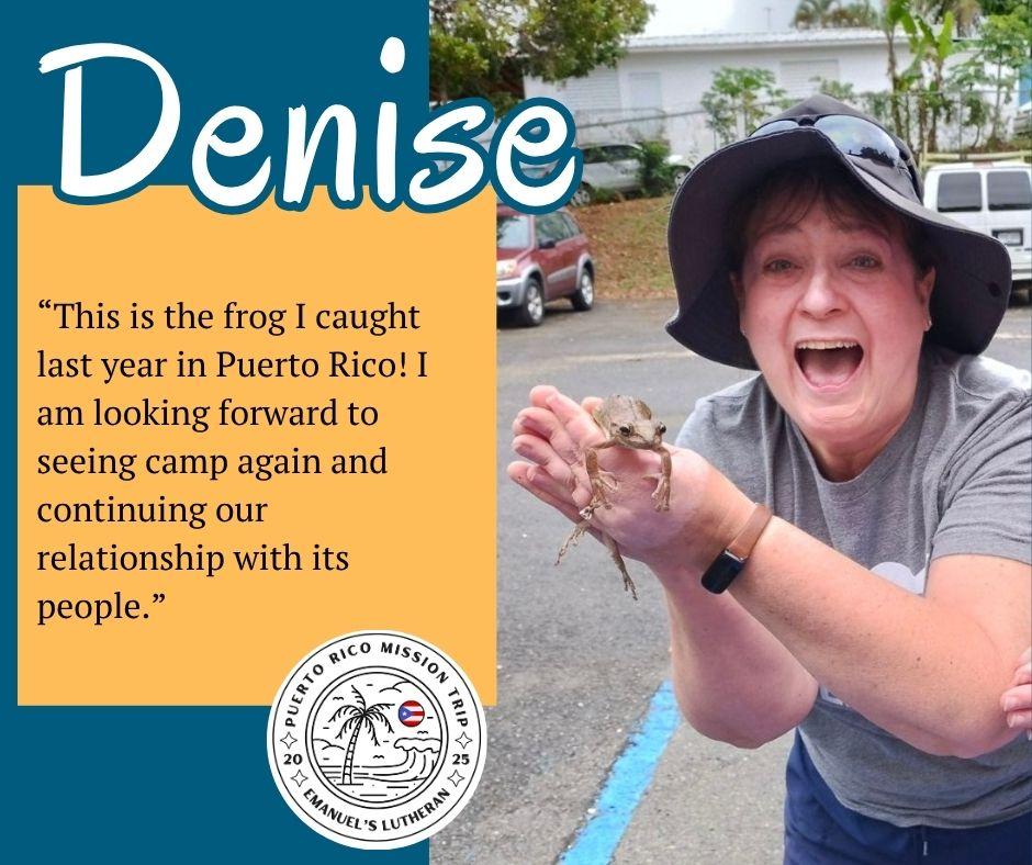 Denise has been on about 20 mission trips, including twice to Puerto Rico and once to El Salvador. The others were stateside. This photo is with the frog she caught last year in Puerto Rico. She is looking forward to returning to see camp and continuing relationships with its people. She also wants to learn more of the Spanish language.