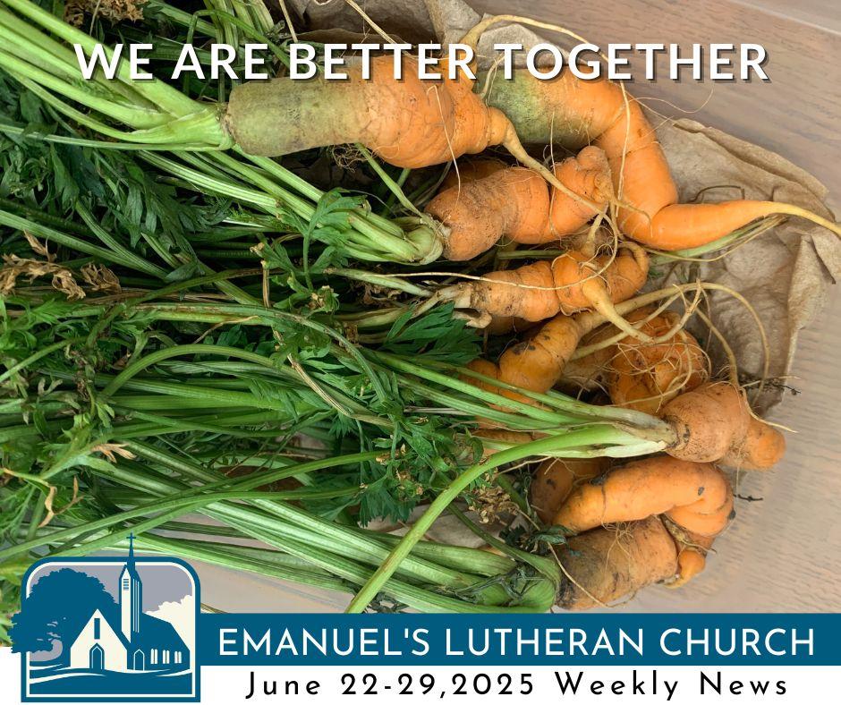 Because Lutherans get tickled. Jim D. from the Garden of Eat'n got a chuckle out of these crazy carrots started from seed by our Day School kids. He explained that each wild reaching root is from a separate tiny seed. The All Team Night attendees also got a kick out of gargantuan, club size cucumbers. How grateful we are to share humor found in unexpected places. Has something at Emanuel's made you smile recently? Let Sherry know. We are better together. | | |