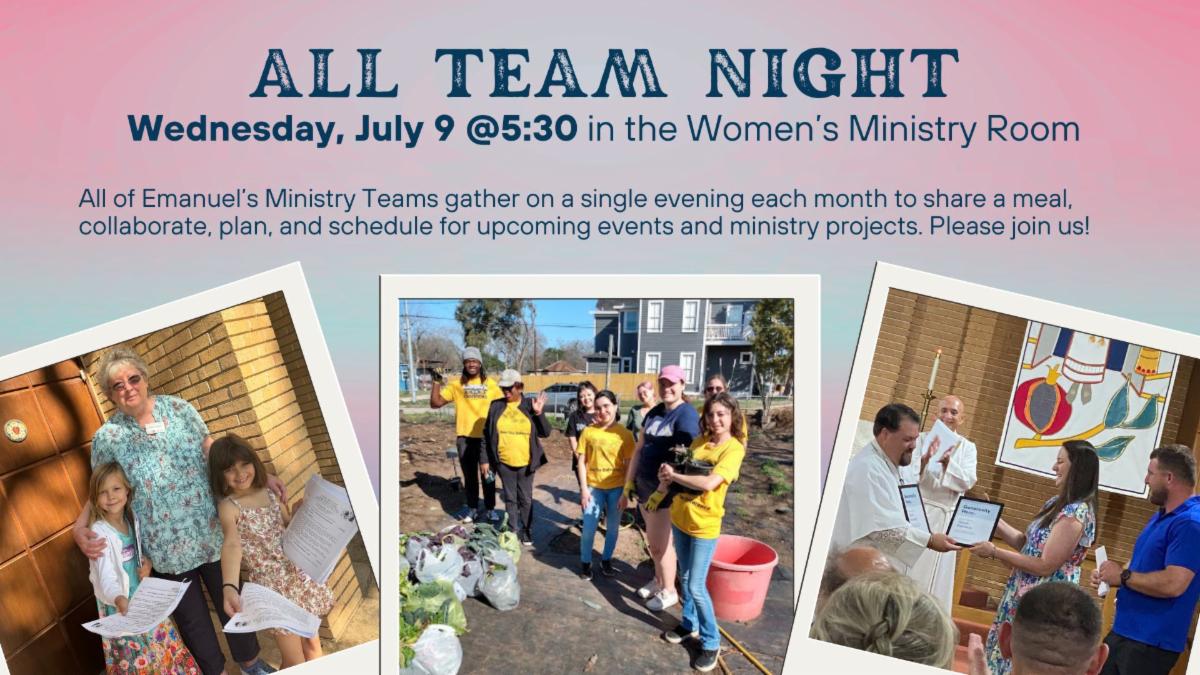Summer living may be easy, but planning never stops! Emanuel's Ministry Teams gather next on Wednesday, July 9 at 5:30 in the Women's MInistry. After dinner we will roll up our sleeves and get to work on events and projects for the second half of the year. Come see what is going on and how you can help.