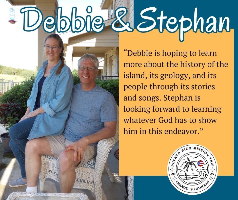 Debbie has experience volunteering at local food pantries. This will be her first time working on a large-scale project. Stephan has gone on several mission trips, two with the Appalachian Service Project and last year’s Puerto Rico trip. He’s also done several Habitat builds and local service projects. Debbie is looking forward to going somewhere she’s never been before, and exploring and experiencing a small piece of Caribbean life! Stephan is looking forward to helping with completing the project for the camp and the fellowship of working with the team.