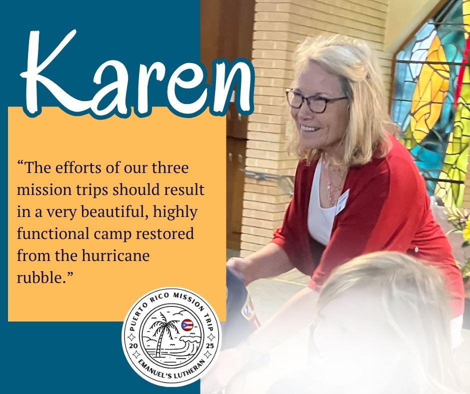 Puerto Rico 2024 was Karen's first ever mission or church camp trip despite being a lifelong Lutheran. "My initial mindset involved seeing a country and it's people that I had never visited before and, essentially, being part of an extension of our ELC Property Steward program. What the trip became was a goal directed ELC (+Palm Valley) family mission.