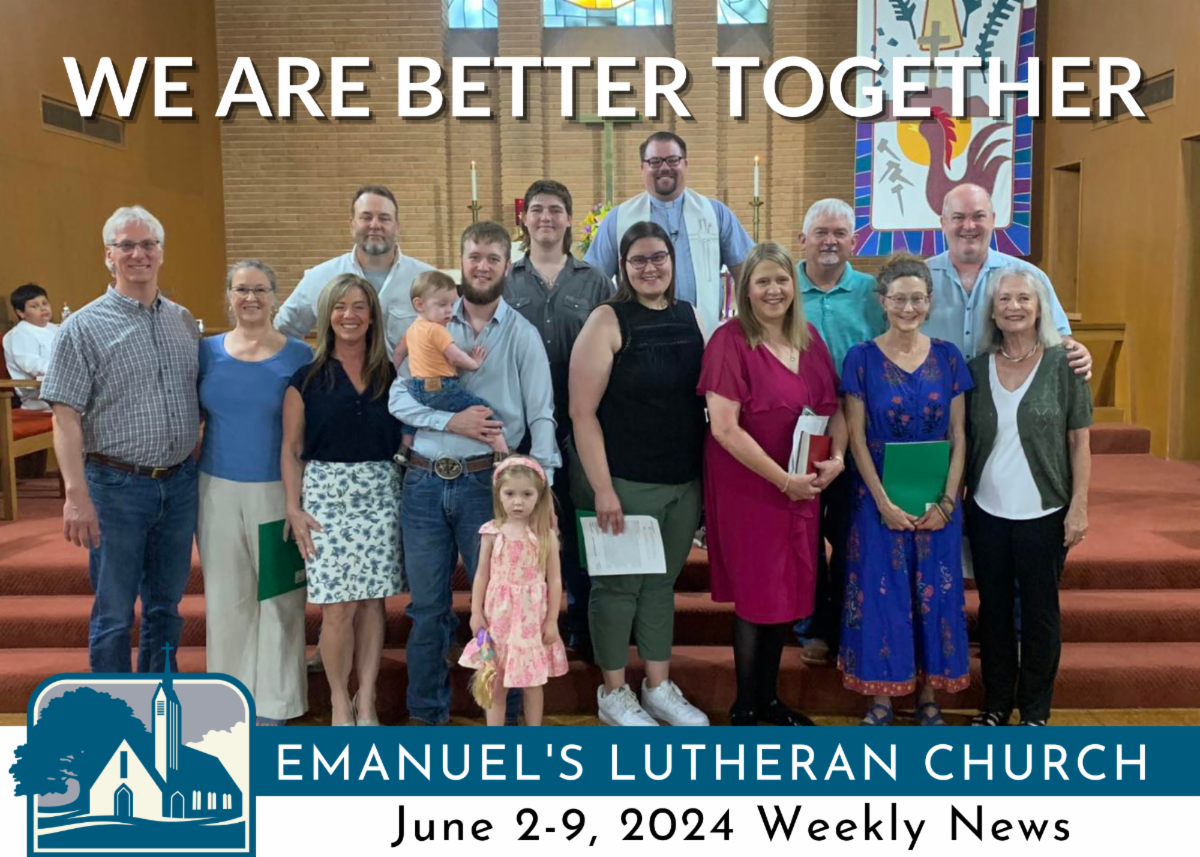 Because Lutherans love being a welcoming community. On Sunday we embraced Jamie, Jimed, Tonya, Bill, Gail, Hunter, Hadley, Braxton, Weston, Debbie, Stephan, Kevin, Jancie, Janelle, and from afar, Johnny and Janet. This summer we are going to be spending a lot of time exploring how best to practice hospitality in all facets of what we do at Emanuel's. Come learn with us! More information is below about Emanuel's 2024 Summer Workshop: "Innovating Welcome!" We are better together.