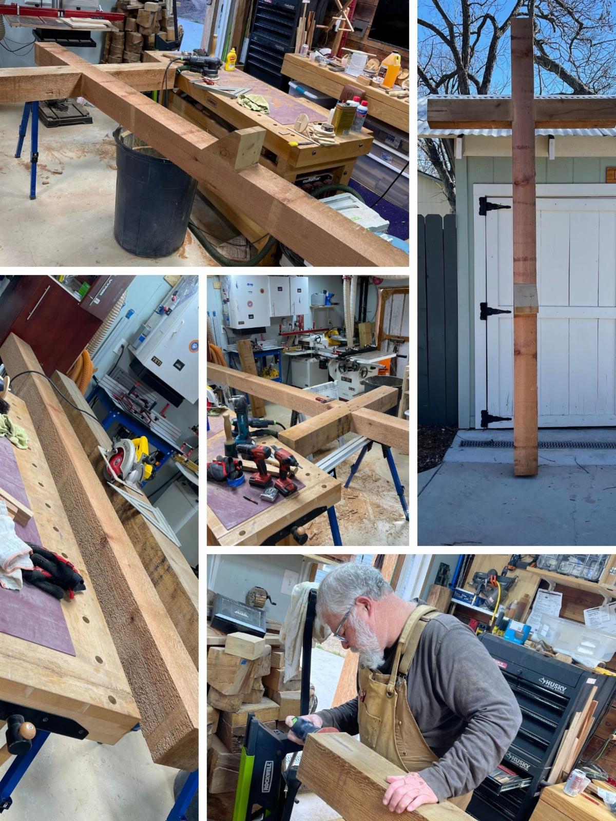 Pastor Marcus asked me if I could build a replacement cross last Lent/Easter because the old one was in such bad shape. This winter I purchased some 6x6 rough cedar to make the replacement and the work began. The vertical piece. Is 10 feet long and the cross piece is 4 feet long.