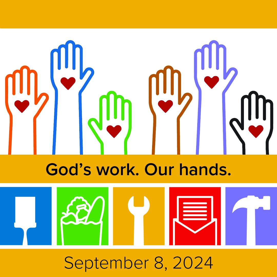 "God's work. Our hands." Sunday is an annual day of service for the Evangelical Lutheran Church in America (ELCA) that takes place on September 8, 2024. It's a day to celebrate the ELCA's identity as a church that serves and loves its neighbors through Christ. It's also a chance to renew commitments to love and serve communities, and to make God's love real by calling for justice.