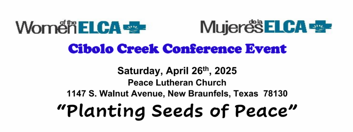Please join us for our annual Cibolo Creek Conference event for Women of the ELCA on Saturday, April 26th at Peace Lutheran Church in New Braunfels. The theme, “Planting Seeds of Peace”, is centered around John 14:27, “Peace I leave with you; my peace I give to you. I do not give to you as the world gives. Do not let your hearts be troubled, and do not let them be afraid.” In our lives today, we deal with fear, uncertainty, and division every day. God, through Jesus, assures us that we do not need to fear. We come together as Women of the ELCA to “grow in faith, affirm our gifts, and support one another in our callings”. Pastor Judi Miller will be our Bible study leader. We are looking forward to a day of nurturing, fellowship, Bible study, and developing new friendships.