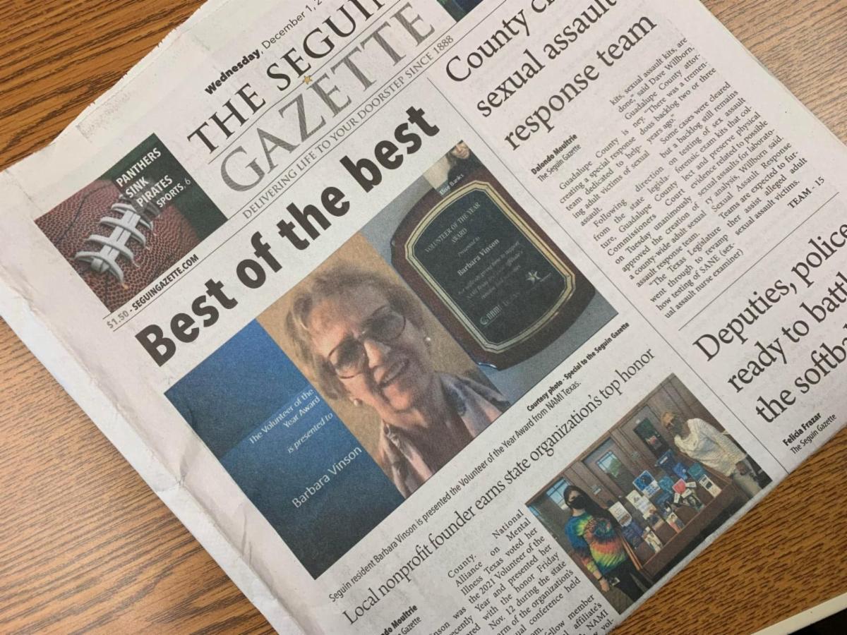 CONGRATULATIONS to NAMI leader Barbara Vinson! She is featured on the front page of the Seguin Gazette this week in recognition of her statewide Volunteer of the Year Award from NAMI, the National Alliance on Mental Illness. We love having the local chapter office here and supporting their good work in Guadalupe County.
