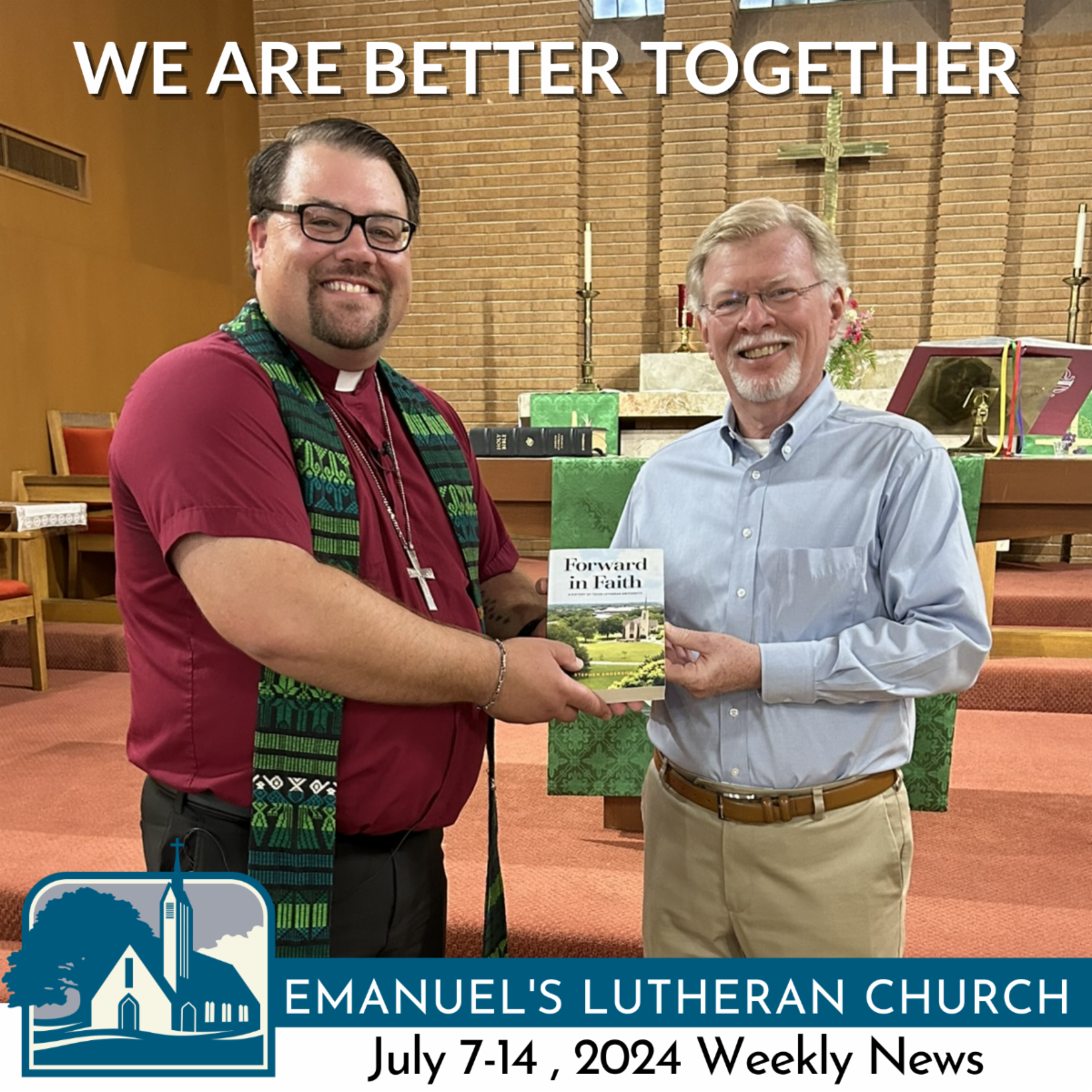 Because Lutherans value history, and we celebrate historians. Congratulations Steve Anderson! His recently released Forward in Faith: A History of Texas Lutheran University is now available to purchase at area booksellers and online. We also have a (signed!) copy to check out in the church office. Lifelong Lutherans and newcomers alike will be drawn to the story's 130+ year span of events and people. Dr. Debbie Cottrell, TLU President, writes, "... Steve Anderson offers a fresh, meaningful, and well-written history of the 'stately college of the plain,' reminding us of how rich the story of Texas Lutheran University is." Steve, thank you for sharing your gifts with us all. We are better together. | |