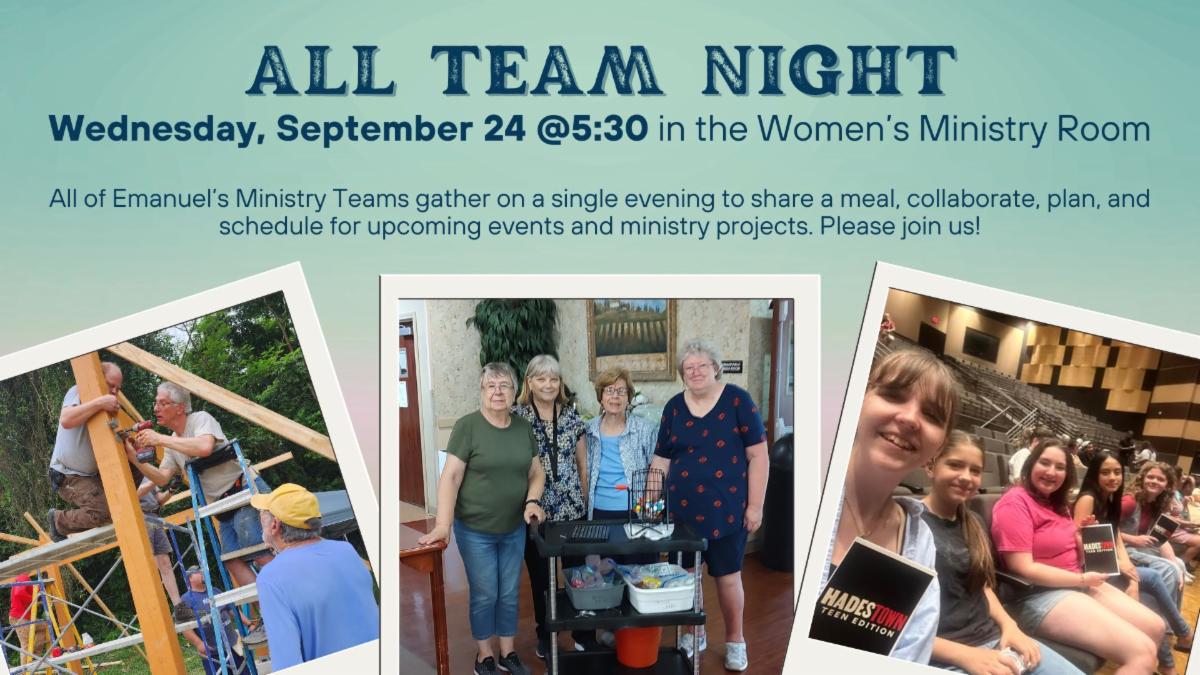Emanuel's Ministry Teams gather next on Wednesday, September 24 at 5:30 in the Women's MInistry. After dinner we will roll up our sleeves and get to work on events and projects to wrap up 2025. Note that in September we will meet on the last Wednesday of the month. Come see what is going on and how you can help.