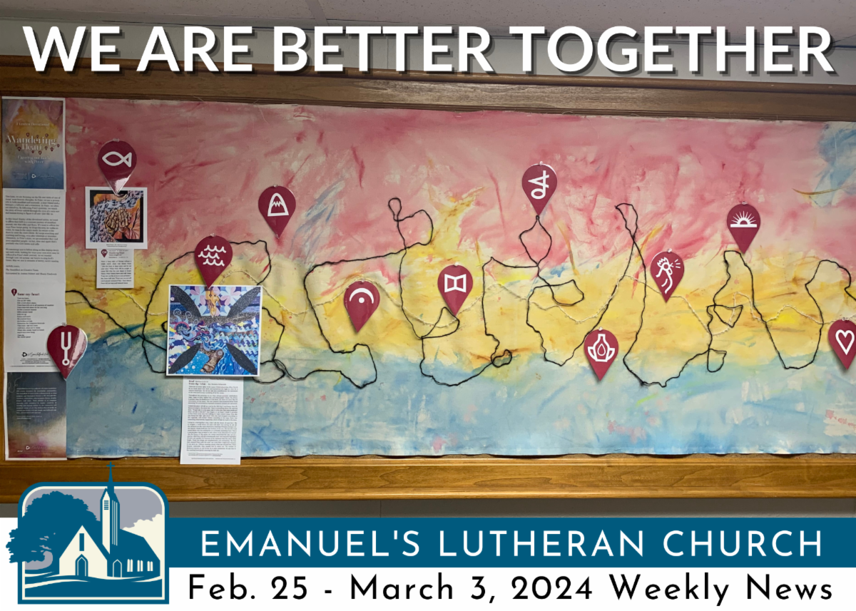 Because Lutherans don't need to wander alone. In our Lenten devotional series "Wandering Heart" we study Peter's faith journey. His path, like ours, is a steadfast pursuit that ebbs and flows. Emanuel's artist Jeanne Palmer helps us experience these unexpected twists and turns along the road. Stop by the second floor hallway display and notice the light colored thread representing the rather smooth path we hope to take in this life, and the contrasting dark colored thread that is our actual, much wilder ride. Check in each week to look for ways your own story may be reflected in Peter's. We are better together.