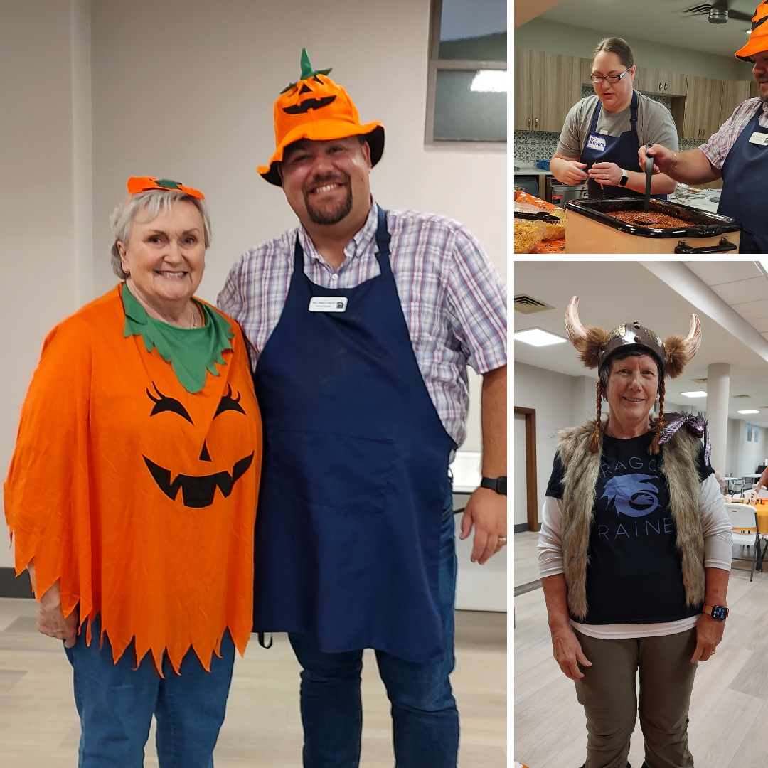 | | Sometimes costumes are just not optional. The October Senior Social Club Luncheon in the Fellowship Hall was just such an occasion. Pastor Marcus served up his Golden Ladle award winning Chili in style. Susie and Janice also rocked to costumes! Mark your calendars for the group's annual Thanksgiving Luncheon on Thursday, November 20 from 11:30-1:30. Catered turkey, dressing and gravy from Davila's BBQ! Everyone is asked to bring a favorite Thanksgiving side or desert to share. Family and friends are welcome. Let Donna know if you can come. | | |