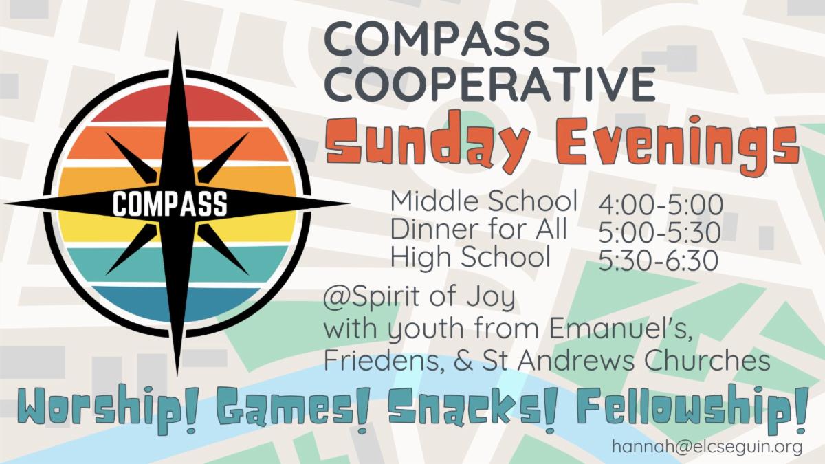 The Compass Cooperative gathers on Sundays with our four church partners - Emanuel's, St. Andrew's, Spirit of Joy, and Friedens Church- at the Spirit of Joy campus, 416 Dolle Ave., Seguin, TX 78155. Contact: Compass Program Director Hannah Hansen.