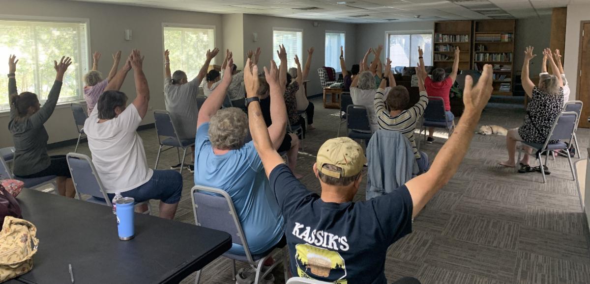 | | Everyone has great things to say about the new yoga classes at Emanuel's! Come see what they are talking about. Gina Touchstone is a Certified Yoga Instructor, RYT 200. Every Monday, Gina leads a beginner Floor Yoga Class at 6pm in the Family Life Center. On Wednesdays she leads the Chair Yoga Class pictured here at 9am in the Family Life Center. Classes are pay-as-you-can, $5+ suggested. Please bring a mat for floor classes. | | |