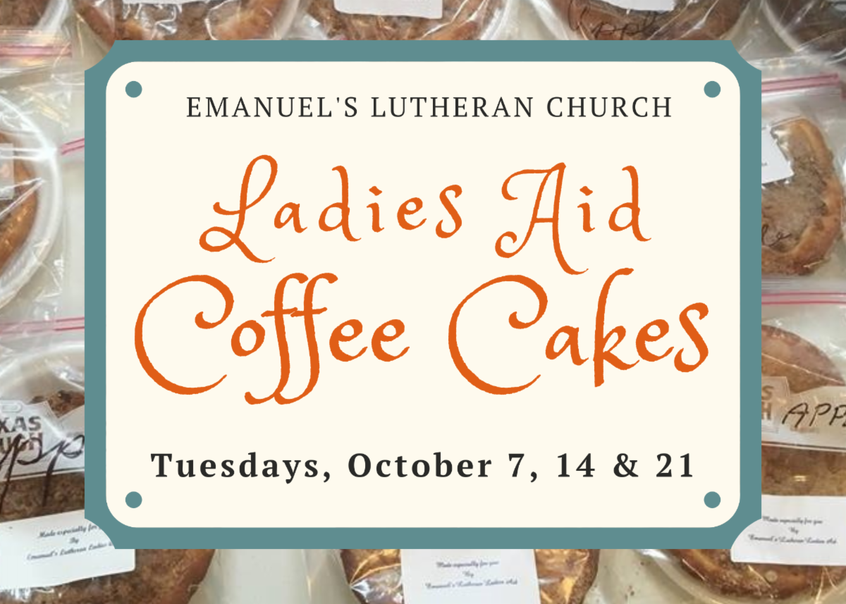 There one more week to make your way down the Fellowship Hall for the heavenly scent of Emanuel's Ladies Aid's FAMOUS coffee cakes. Come get yours on Tuesday, October 21 as the women celebrate their 126th Anniversary. Contact a Ladies Aid Member or the Church Office at 830-379-5046 for more information. Pre-orders most welcome.