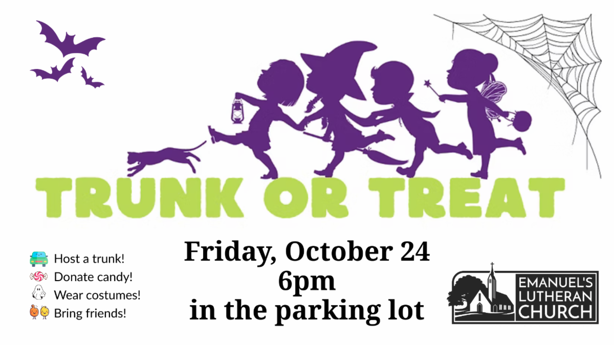 | TRUNK OR TREAT is a great way to welcome cooler temps, all things pumpkin, and a wee bit of mischief. Let Pastor Marcus know if you will be hosting a trunk and handing out treats to little goblins on Friday, October 24th from 6-8pm in Emanuel’s parking lot. CANDY DONATIONS are also welcome in the narthex and church office. Start thinking about your costumes and invite your friends. We are going to have a delightfully spooky time! | |