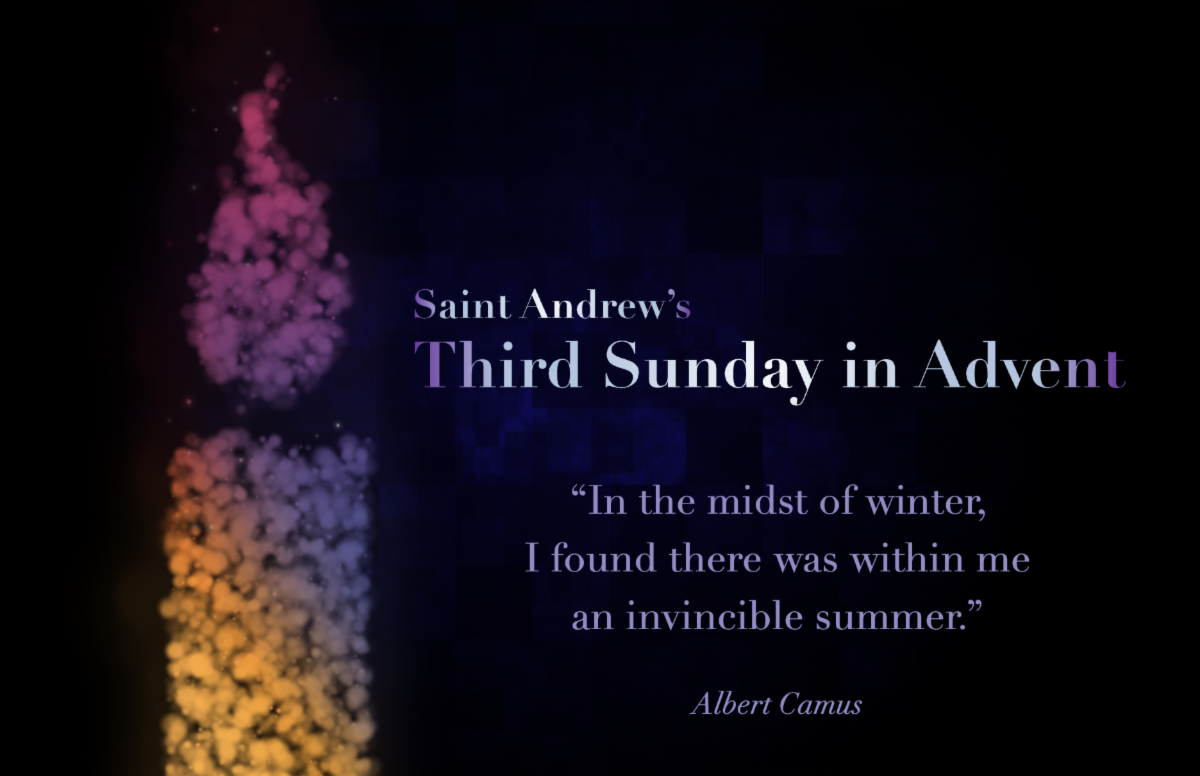 Welcome to the Third Sunday in Advent. We will light the candle for Joy. Is it really a spiritual imperative, in the same vein as our other Advent lights: hope, peace, and love? Susan will offer a reflection, with a firm footing in reality, thanks to existential philosopher Albert Camus. The Mostly Righteous will bring two - YES TWO - songs, sparking joy in the midst of this winter. We'll also have cookies to buy, coffee to drink, and conversations to carry on. See you Sunday.