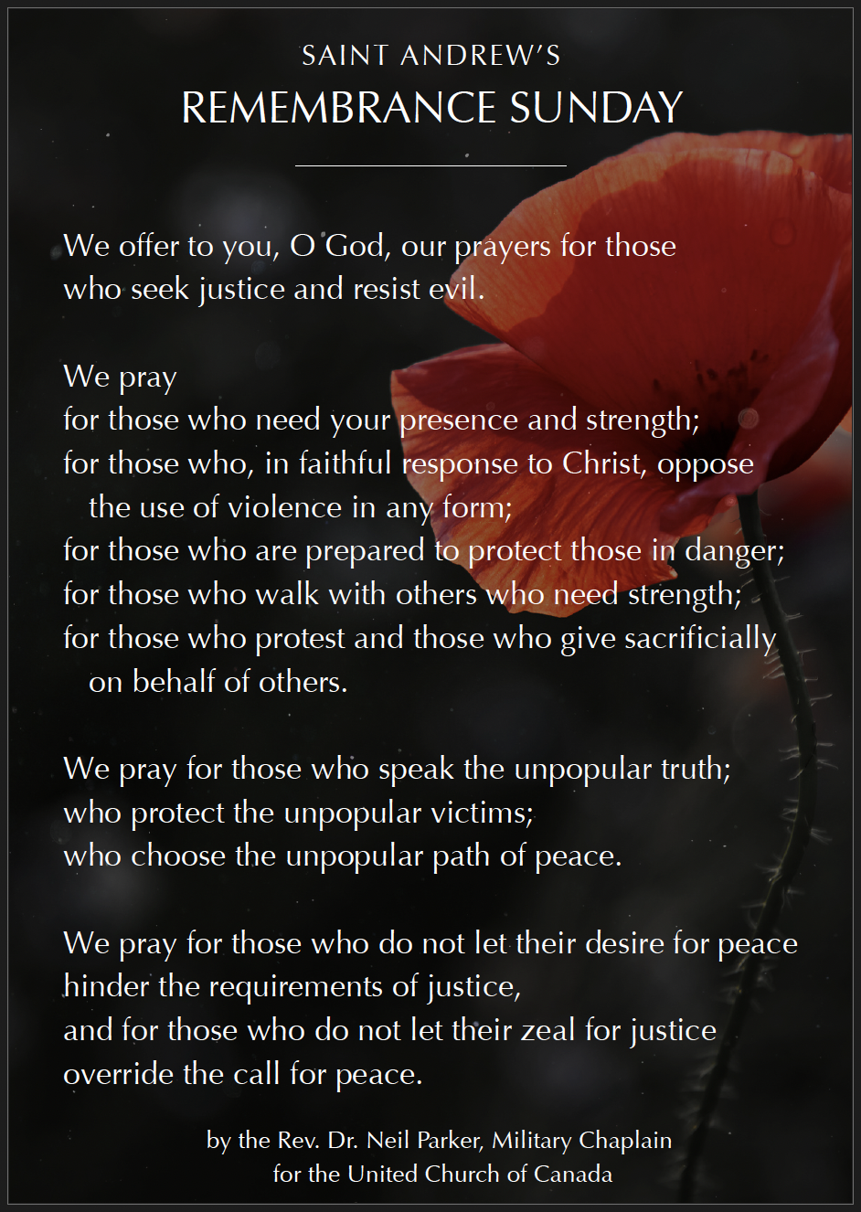 The author of this prayer, Military Chaplain Rev. Dr. Neil Parker, will not be with us this Sunday, but his words will. This prayer walks the line of peace and justice, so we who are challenged by that line might say it together. And perhaps say it again, on November 11 when our nation calls for remembrance and reflection.