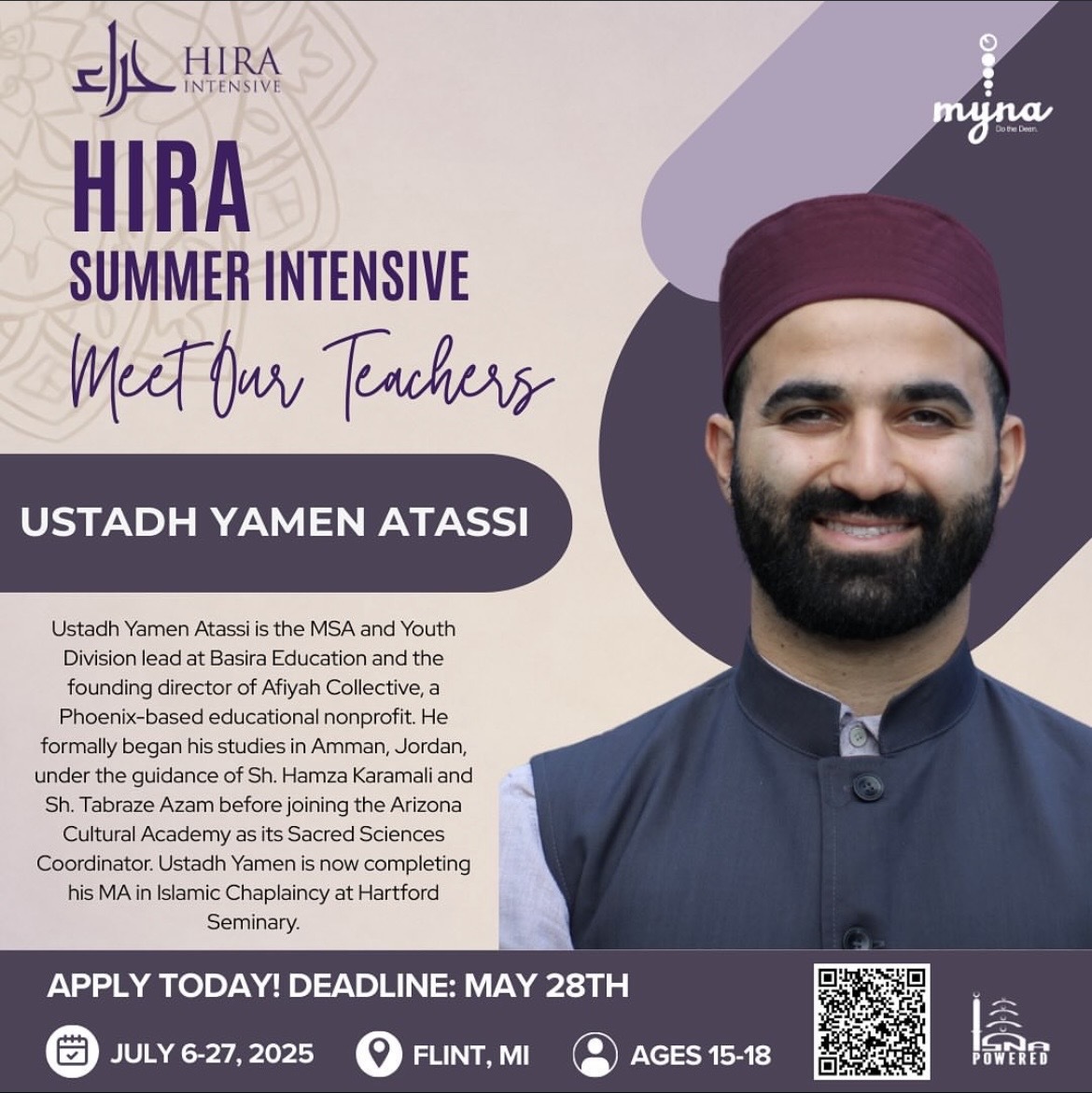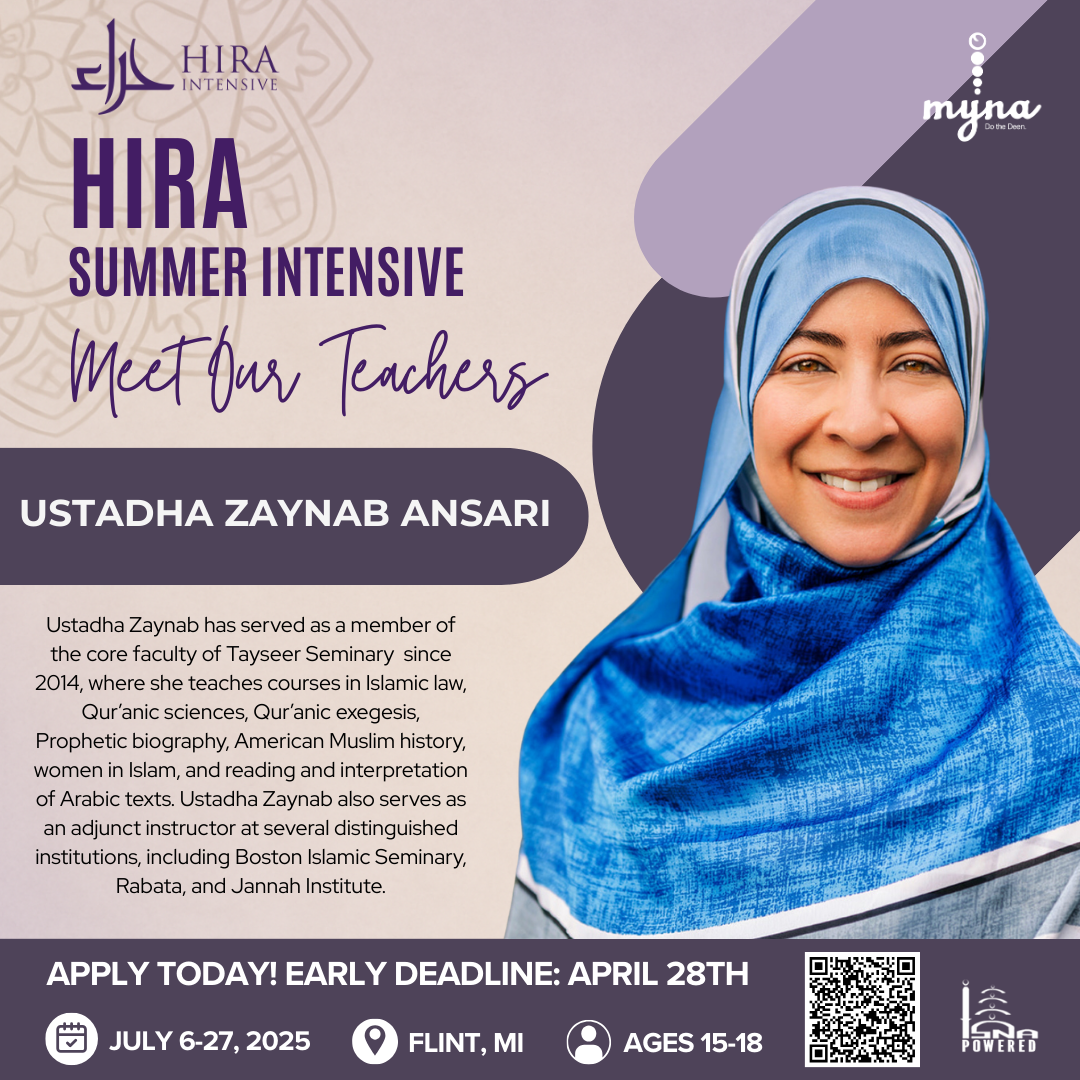 This year's HIRA Intensive course will be held July 6-27, 2025 in Flint, Michigan. The Beloved Prophet (s) retreated to the Cave of Hira as a place of solitude to reflect upon himself and build his relationship with his Creator. In the same light, MYNA’s Hira Intensive calls upon youth to dedicate time towards strengthening their mind, body, and soul through a deeper understanding of the foundations of faith. From studying tafsir and fiqh to understanding who our Creator is, who His Prophet (s) is, and who we are, this program aims to equip the youth of today with the knowledge and skills to navigate the modern world around them.