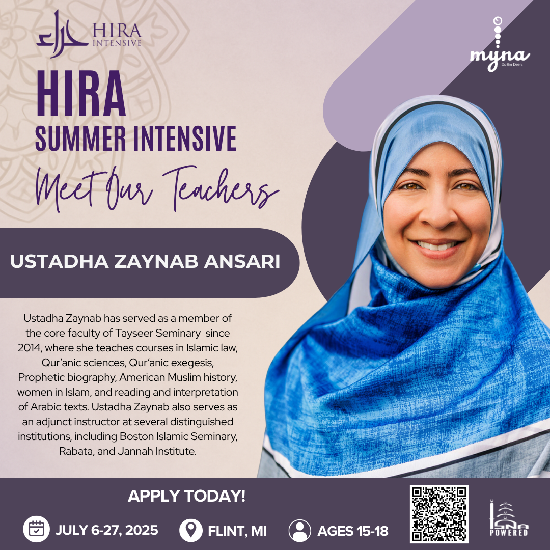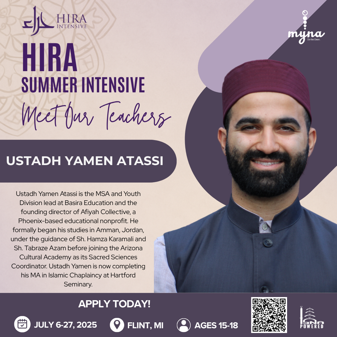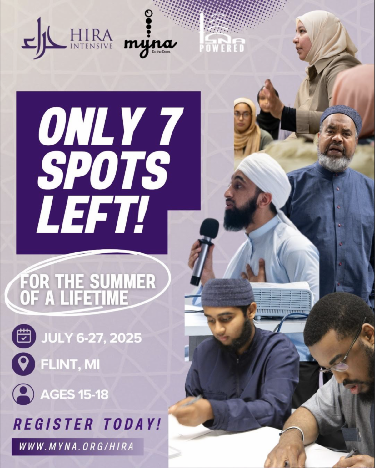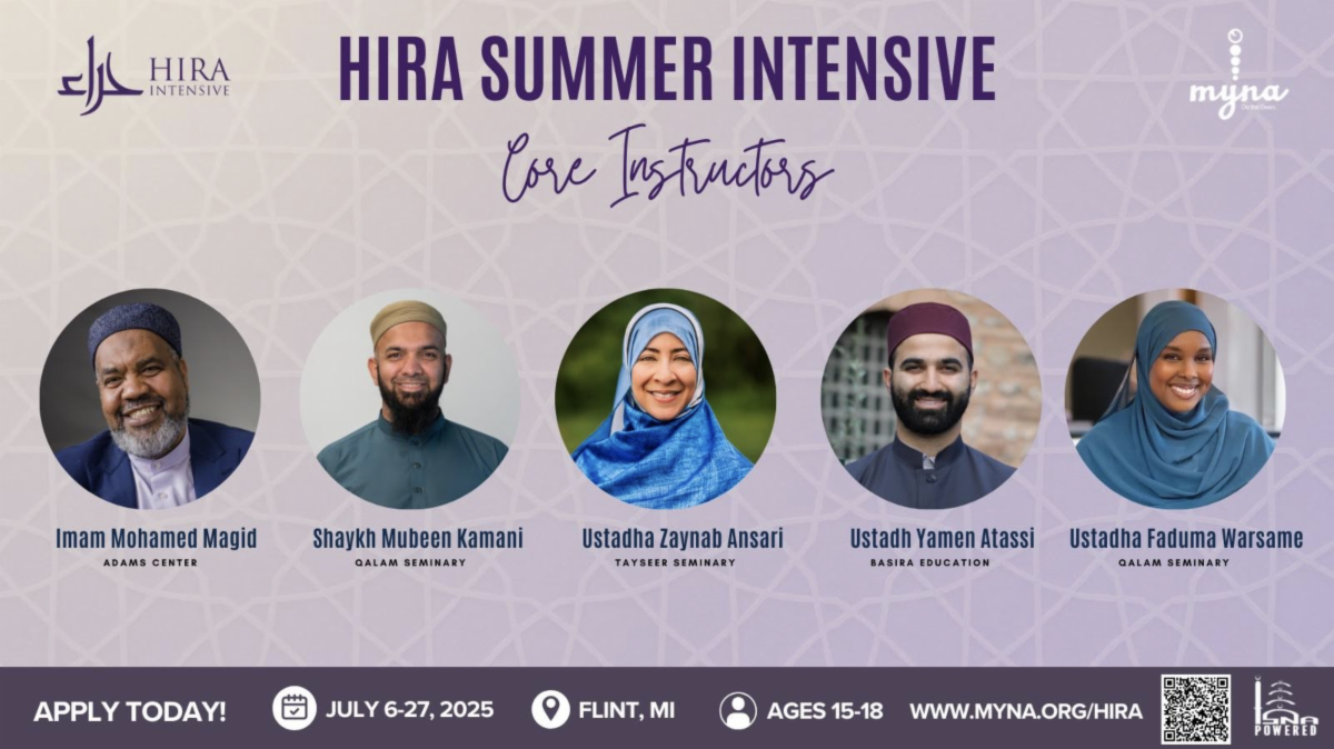 This year's HIRA Intensive course will be held July 6-27, 2025 in Flint, Michigan. The Beloved Prophet (s) retreated to the Cave of Hira as a place of solitude to reflect upon himself and build his relationship with his Creator. In the same light, MYNA’s Hira Intensive calls upon youth to dedicate time towards strengthening their mind, body, and soul through a deeper understanding of the foundations of faith. From studying tafsir and fiqh to understanding who our Creator is, who His Prophet (s) is, and who we are, this program aims to equip the youth of today with the knowledge and skills to navigate the modern world around them.