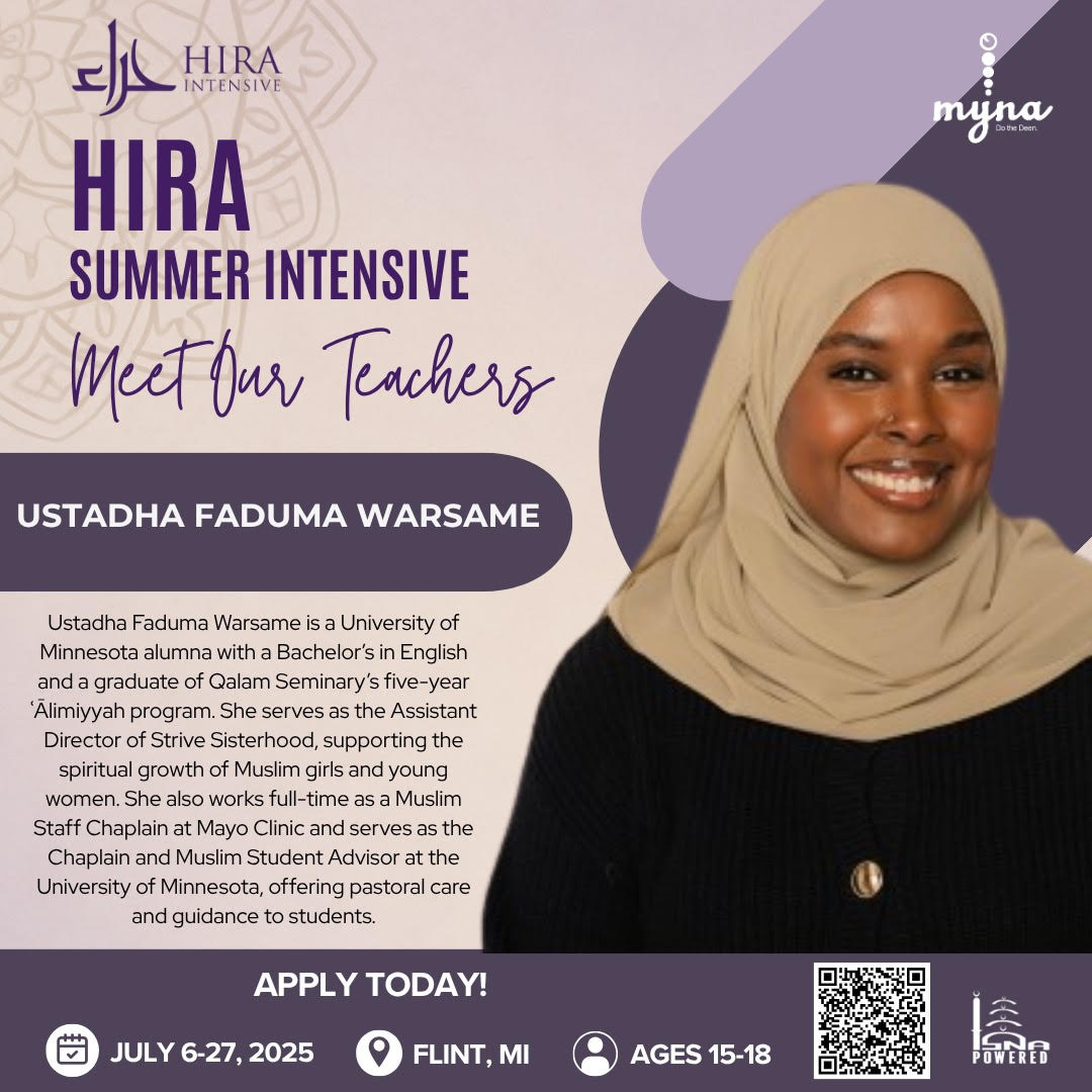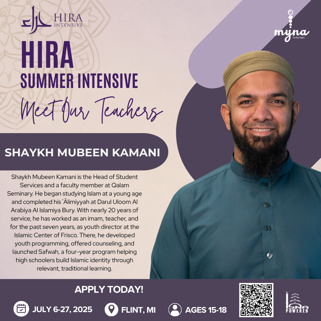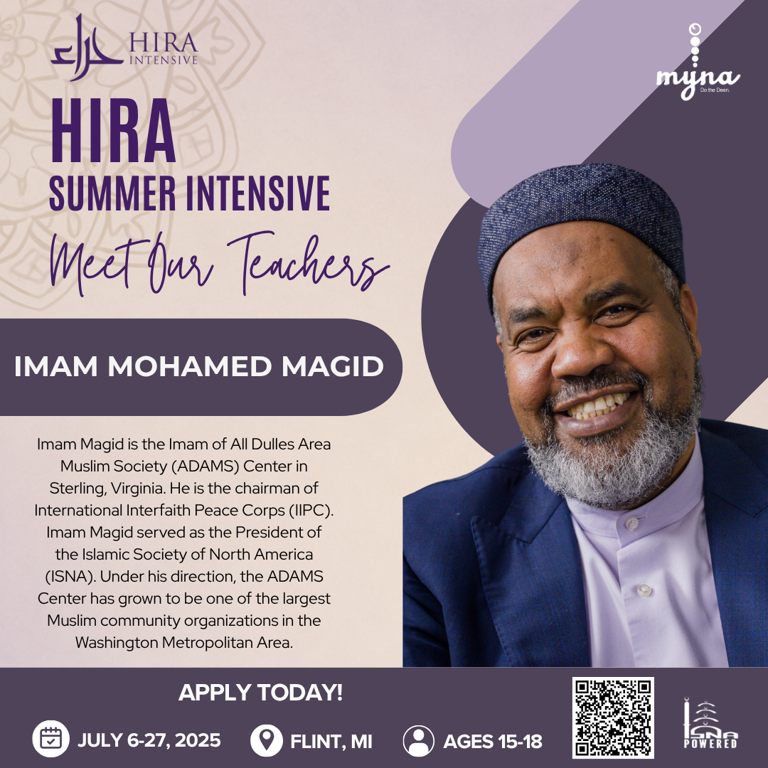 This year's HIRA Intensive course will be held July 6-27, 2025 in Flint, Michigan. The Beloved Prophet (s) retreated to the Cave of Hira as a place of solitude to reflect upon himself and build his relationship with his Creator. In the same light, MYNA’s Hira Intensive calls upon youth to dedicate time towards strengthening their mind, body, and soul through a deeper understanding of the foundations of faith. From studying tafsir and fiqh to understanding who our Creator is, who His Prophet (s) is, and who we are, this program aims to equip the youth of today with the knowledge and skills to navigate the modern world around them.