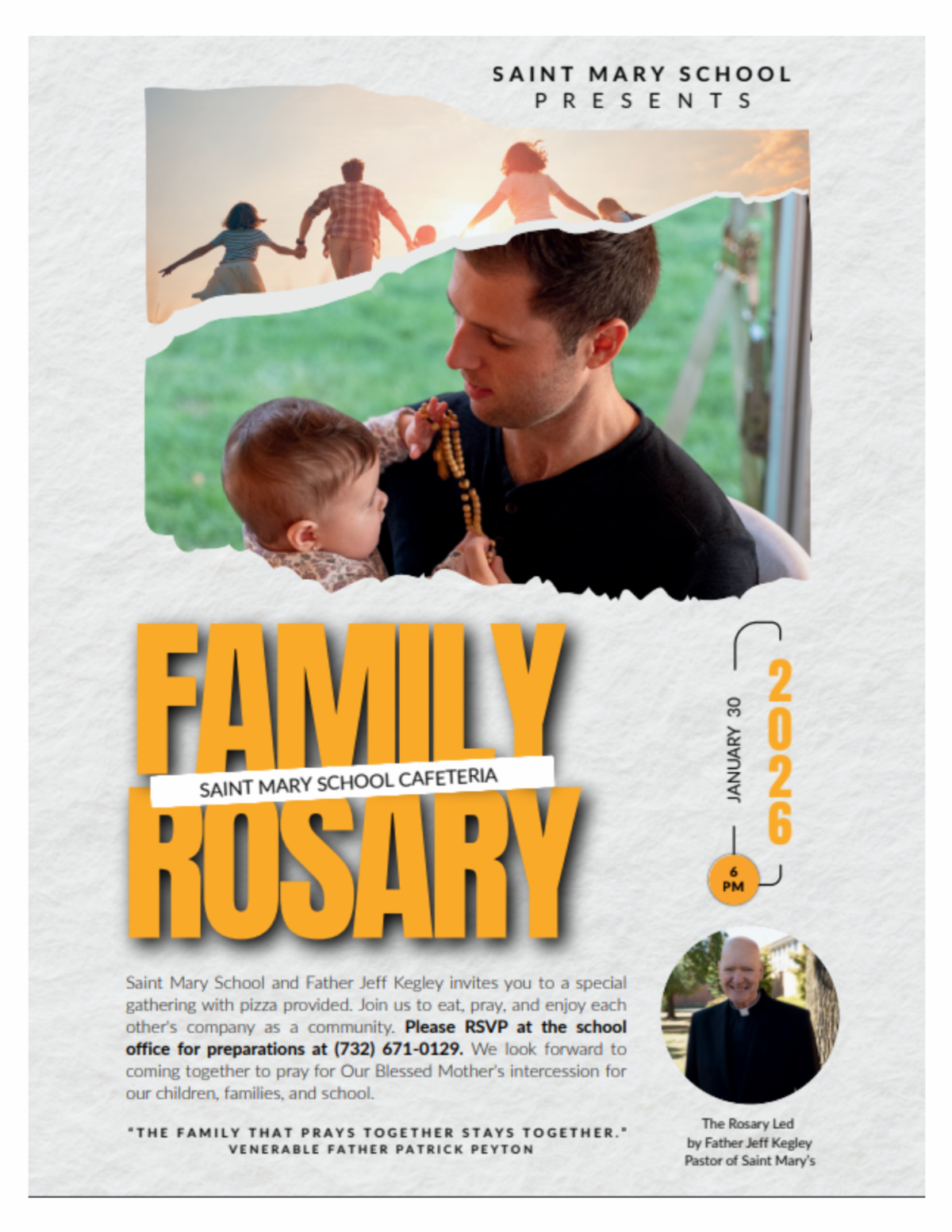 Finally, I warmly invite all Saint Mary School families to join me for a Family Rosary on Friday, January 30th at 6:00pm. We will gather as a school family to pray together, entrusting our children, our families, and our school to the loving intercession of Our Blessed Mother. Pizza will be served, and I ask that you please RSVP to the school office so we can plan accordingly. Thank you for the gift of your family, your faith, and your continued commitment to Saint Mary School. Be assured of my prayers for you always.