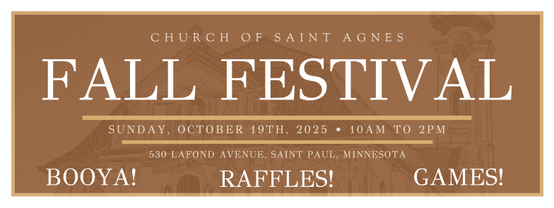 Join us after Holy Mass this Sunday, 10/19 for our annual Fall Festival from 10AM-2PM in Bandas Gymnasium for games, food, and booya!