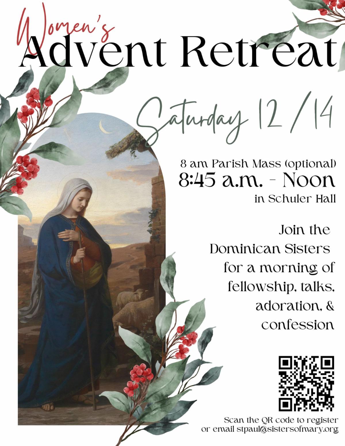 Women of the parish and school are invited to join the Dominican Sisters for an Advent morning of reflection on Saturday, December 14th. The morning will begin with optional Mass at 8:00 am in St. Agnes lower church, followed by fellowship at 8:45 in Schuler Hall, talks, adoration, and confession, concluding at noon. Please register for the event at this address (https://forms.office.com/r/1uFKrcjpM7) or email the sisters at stpaul@sistersofmary.org.