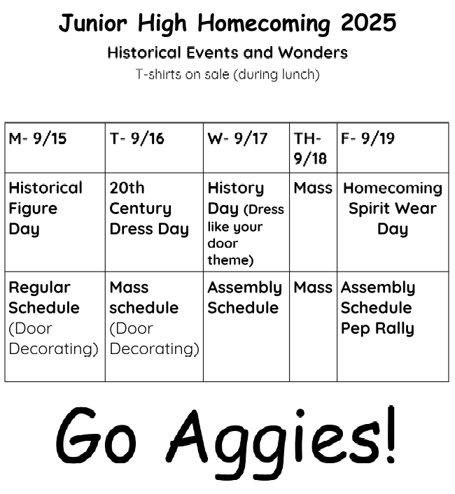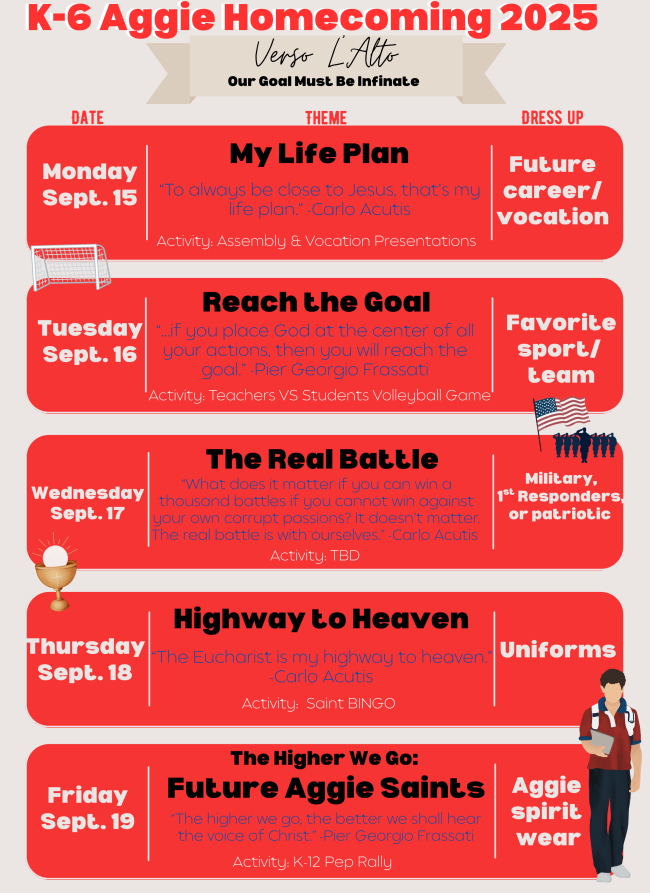 Thank you all for your support last week as we made a couple adjustments to strengthen our already enhanced security protocols—so many of you expressed your gratitude for our handling of the hours and days after the Annunciation shooting during Mass. During Mr. Kiehl’s absences this year, Mr. Rodrigo Flores, a current Aggie parent, will be present each morning to manage traffic and the crosswalk by Door 3 from 7:15 to 7:55 AM and then secure access to our parking lot and building for the remainder of the morning on school days until Mr. Kiehl returns. We are grateful to Mr. Flores for filling in during Mr. Kiehl’s temporary absence.