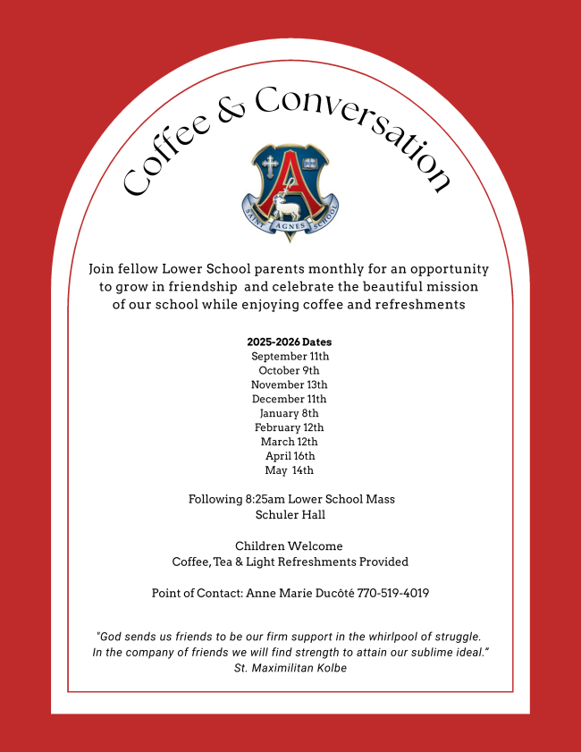 First Coffee and Conversation is September 11 in Schuler Hall after the 8:25AM Lower School Mass. Please come and enjoy some delicious coffee and treats and socialize with other Aggie parents.