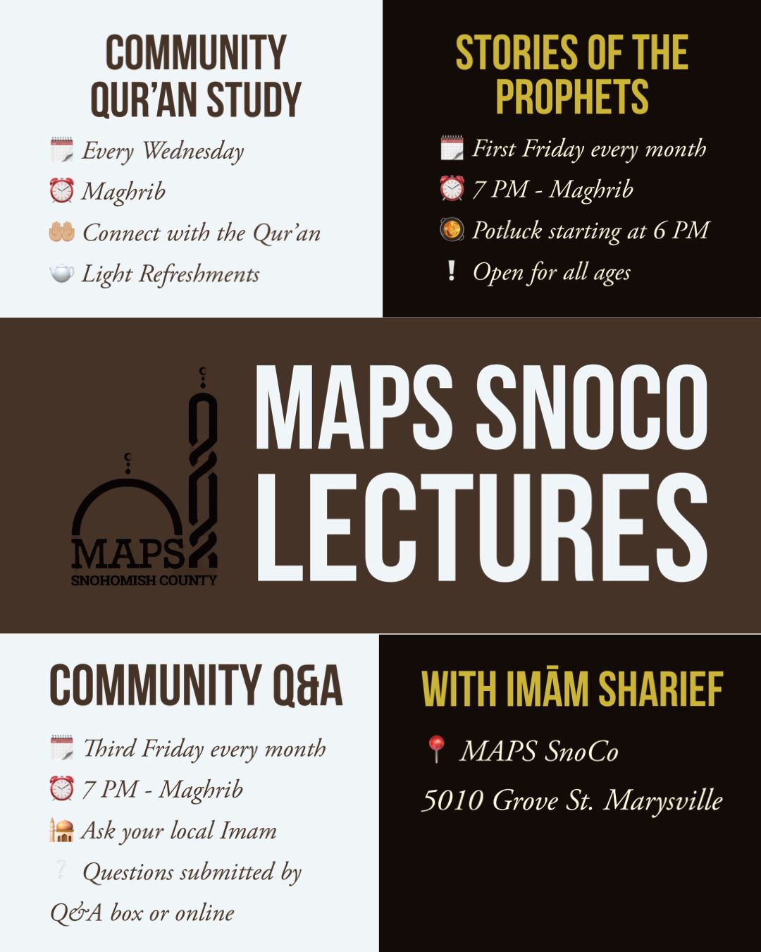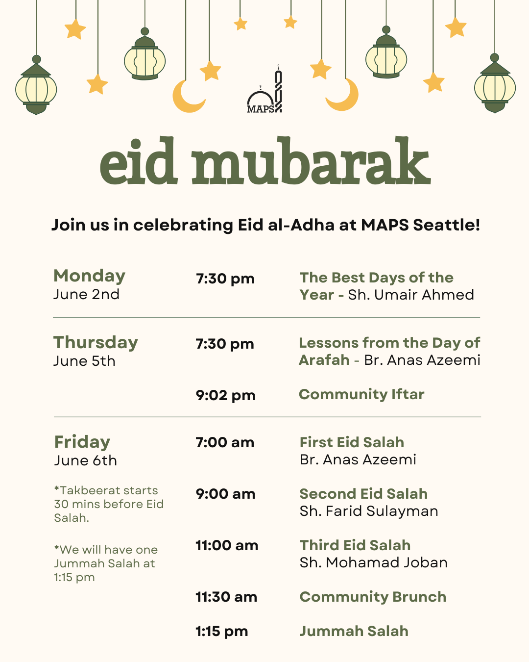 MAPS will be celebrating Eid al-Adha on Friday, June 6th! The full Eid details and prayer times for all 3 of our locations will be available on our Eid webpage.