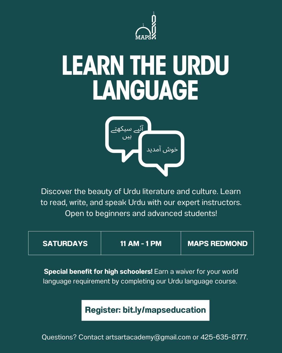 Discover the beauty of Urdu literature and culture. Learn to read, write and speak Urdu with our expert instructors. Open to beginners and advanced students. The class will take place every Saturday from 11 am - 1 pm at MAPS.