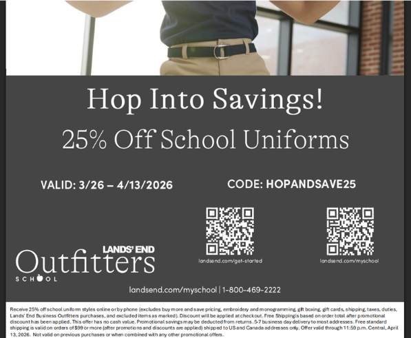 School Uniform Sale from Lands End! If you are looking to refresh your child's uniforms for this school year, or purchase new ones for the 2026/2027 school year, please check out the School Uniforms at Lands End for a 25% discount!