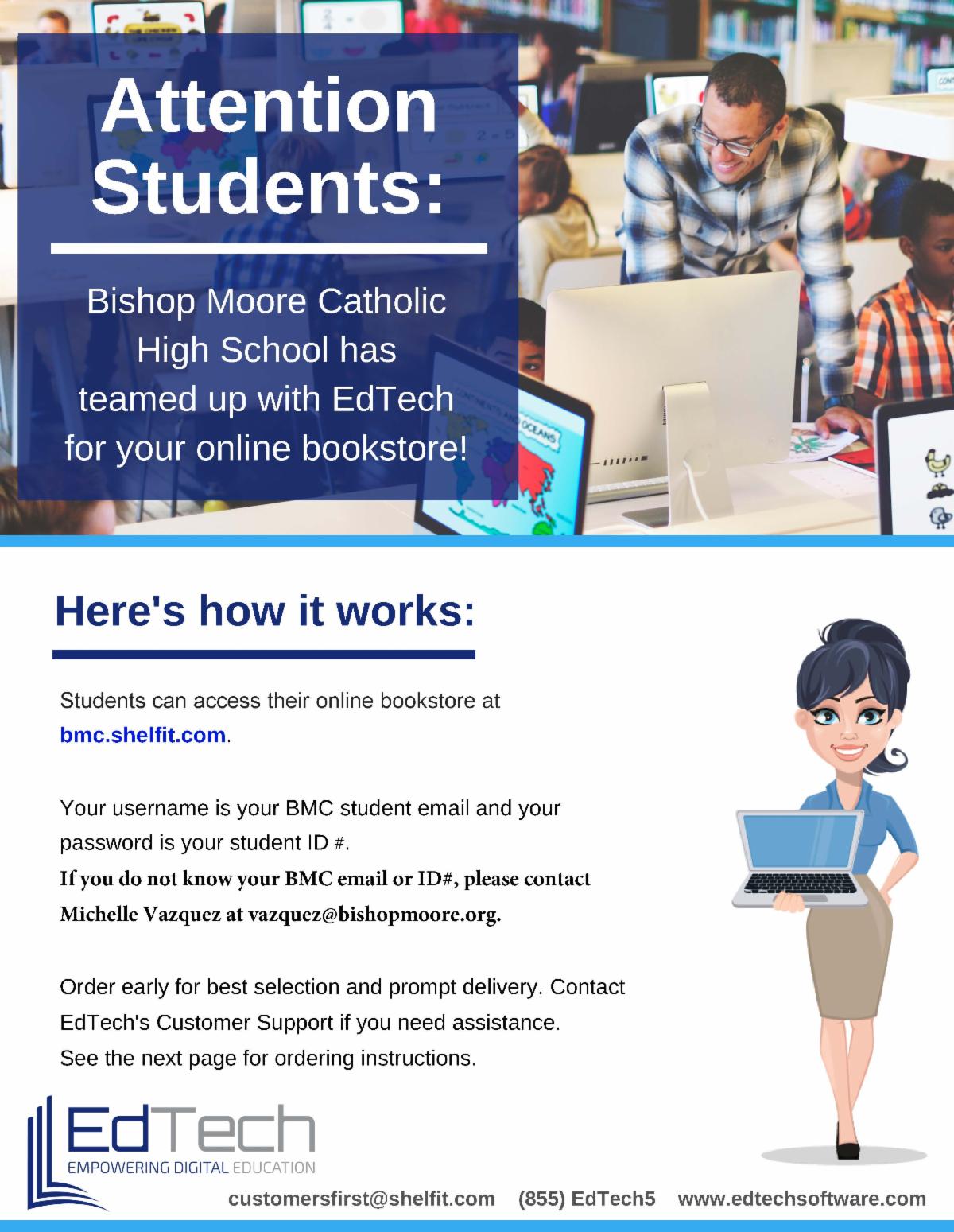 Our focus has remained on enhancing student learning while minimizing costs and providing convenience. Bishop Moore Catholic has partnered with EdTech Software as the supplier of all of our e-textbook needs. Most, but not all courses have a selected e-text.
