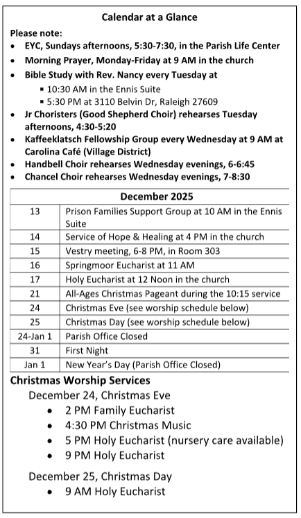 Advent is a special and busy time in the life of the parish. We hope that each of you will join us and bring friends to the special worship services and fellowship activities this Sunday and throughout December. Visit our Advent page for more info: https://www.cgs-raleigh.org/advent.html