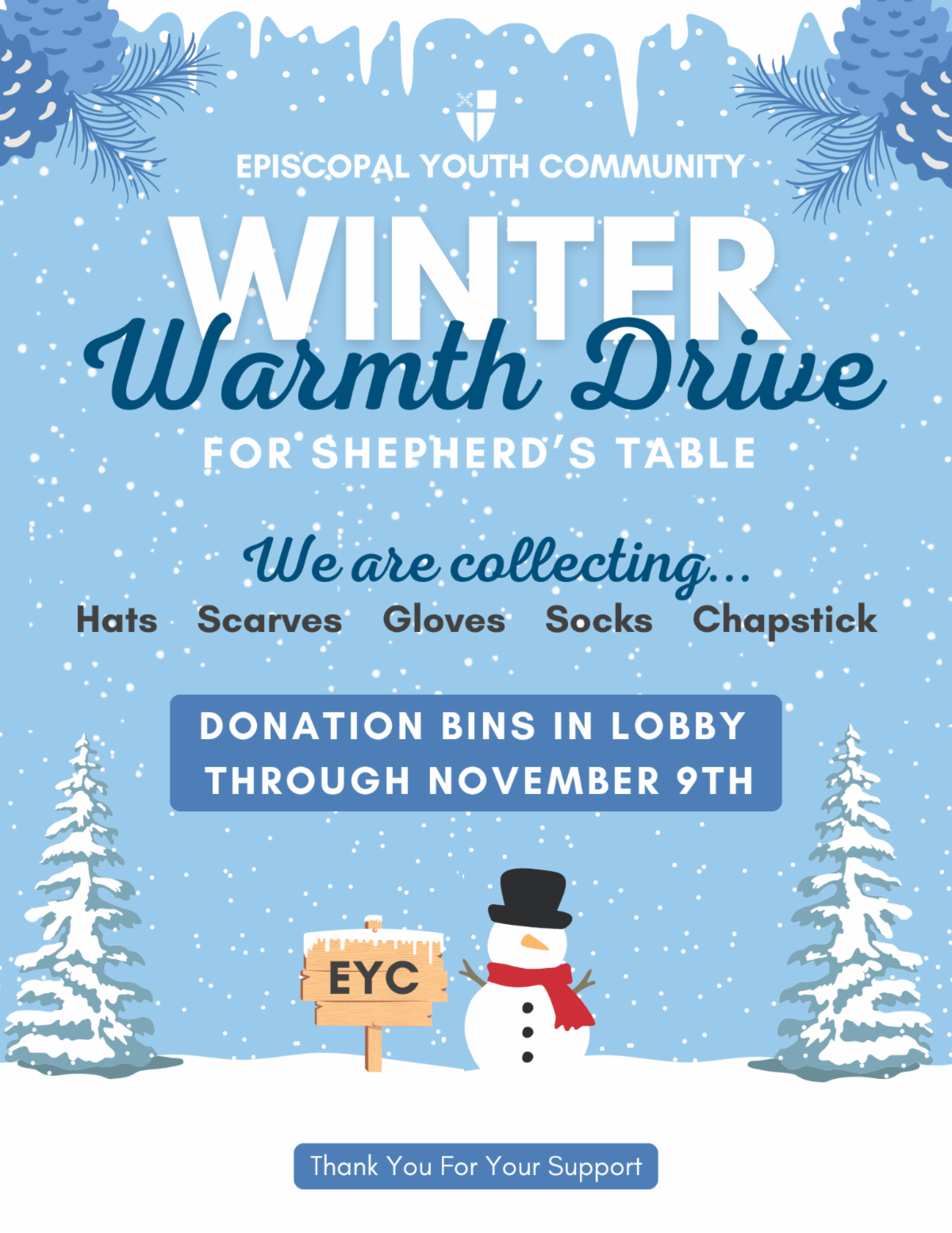 The Episcopal Youth Community is now accepting donations for their annual Winter Warmth Drive.
