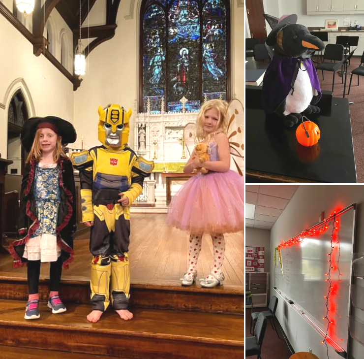 | | The Good Shepherd Choir has been hard at work on their musical offerings for November and December, but that doesn't mean they haven't had time for fun! At rehearsal this week, they celebrated their hard work with a Halloween Party, coming in costume, playing musical games, and ending with pizza and doughnuts. Even Douglas the Penguin came in costume! The Good Shepherd Choir sings next on Sunday November 16 for the 10:15am Eucharist. |