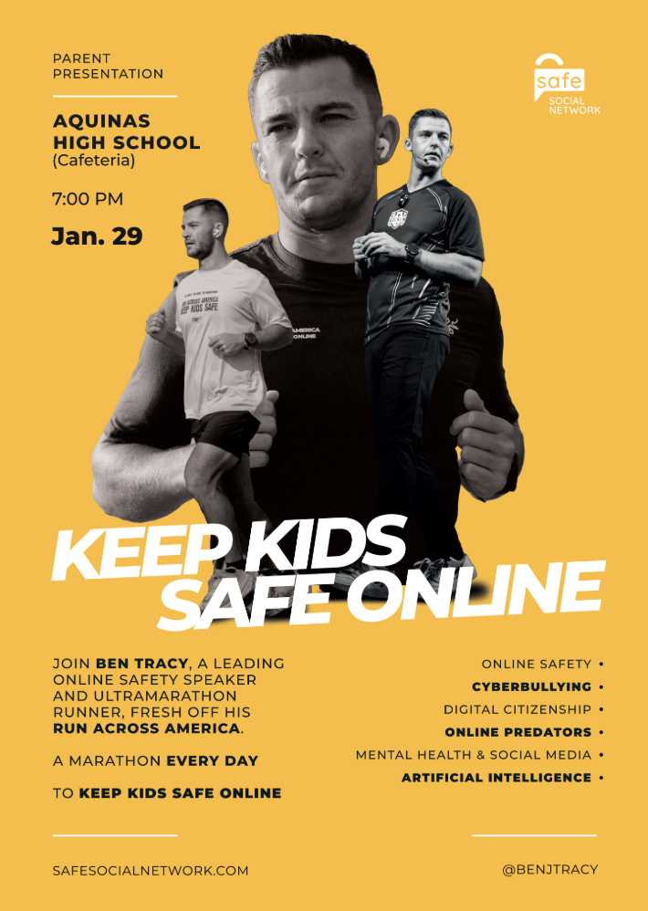 | Save the Date for these Upcoming Events | Tryouts and practice will begin Monday, January 26th at Newman Tennis Center at 3:30. Matches begin on February 9th vs Fox Creek. | Parent/Grandparent Rosary | Parent/Grandparent Rosary and Coffee. All are welcome on Tuesday, January 27th at 8:10 a.m. in the chapel. | Competition Cheer Interest Meeting | Are you interested in being a part of the Irish Competition Cheerleading team? Coaches will be holding an interest meeting on Wednesday, January 28th at 7:00 pm in the Media Center. Come learn what it takes to compete with the Irish! This meeting will be for Competition Cheerleading only. | Save the Date: Parent Education Session | Ben Tracy, nationally known online safety speaker who talks about social media dangers, cyberbullying, predators, mental health impacts, and responsible use of social media, will be at Aquinas on Thursday, January 29th at 7:00 p.m. Parents are encouraged to attend. Click HERE to RSVP! | |