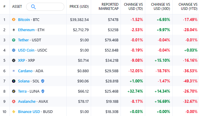 The total implied network value (market cap) of the digital assets market stands at $1.66tn, down 9.2% from last week (when it stood at $1.83tn). Bitcoin’s network value is 6% of gold’s market cap. Over the last 7 days, BTC is down 1.5%, ETH is down 2.5%, and LUNA is up 32.7%. Bitcoin dominance is 45%, up 3 percentage points from last week.
