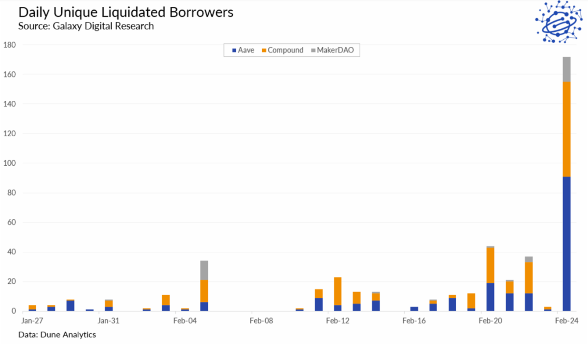 February 24th saw 172 unique borrowers liquidated across the most popular DeFi lending platforms on Ethereum, totaling over $12m in value.