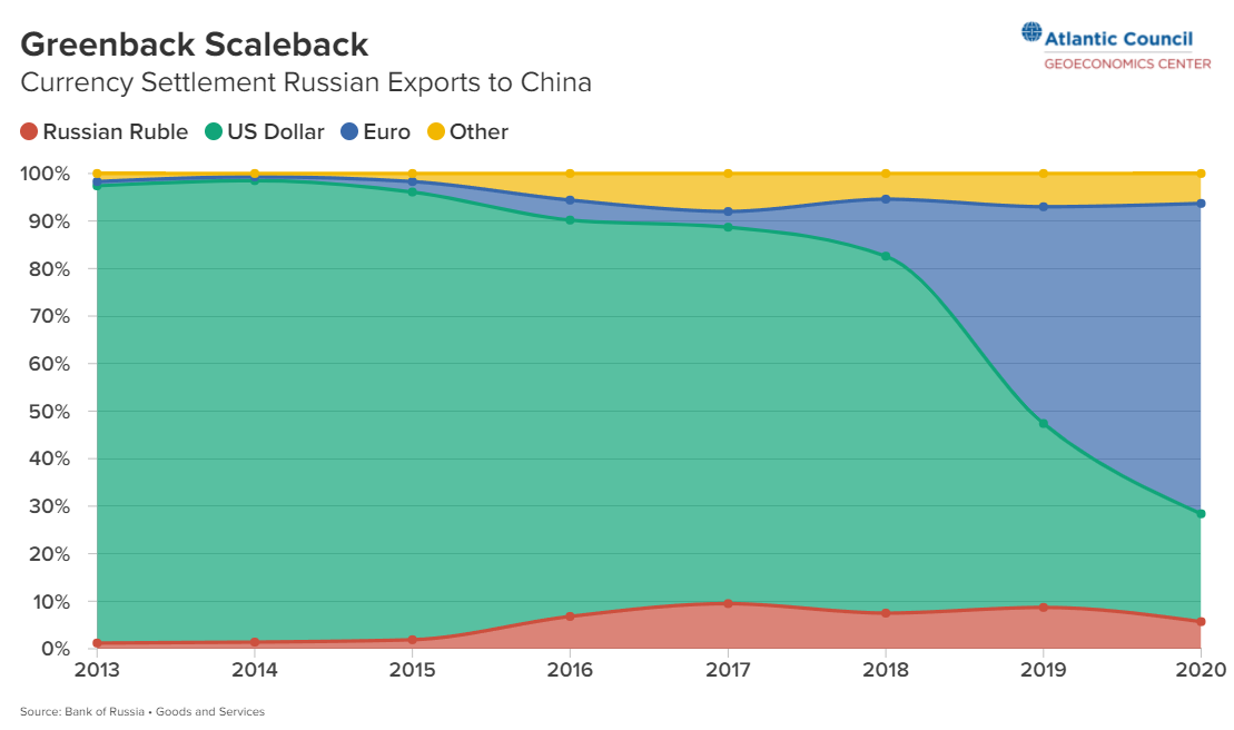 Russia and China have made de-dollarizing their bilateral trade a priority. The two nations have signed several long-term energy deals, some of which will settle in Euros rather than dollars.