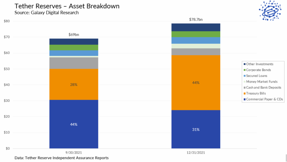 Tether and Anchor update composition of reserve assets. Tether's latest reserves attestation shows reduced risk profile for USDT. Consolidated reserve assets totaled $79bn at 2021 year-end, up 14% from the previous quarter. Tether reduced its holdings of commercial paper by 21% q/q to $24bn (representing 31% of reserve assets vs. 44% as of 9/30/21) in favor of a higher mix of money market funds and treasury bills.