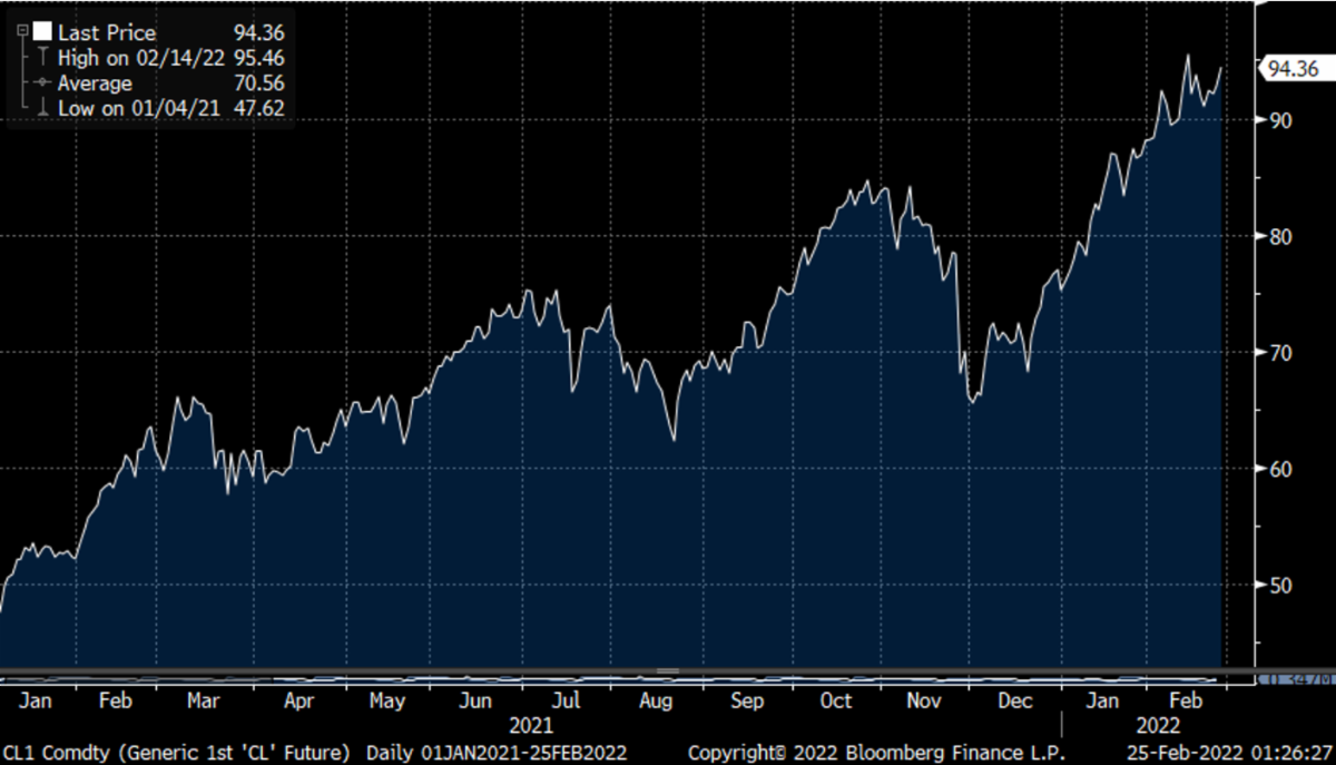 Year to date, the S&P 500 is down 10%, the NASDAQ is down 14%, Bitcoin is down 17%, and Ether is down 28%. European markets were down 3-4% Thursday and Asian markets were off 2-3%. Gold, bonds, and energy traded higher. Commodities are likely to go higher both as a due to sanctions on Russia and supply chain disruptions resulting from the conflict. Some of Russia’s biggest exports include oil, refined oil products, natural gas, coal, platinum group metals, semi-finished iron, low-quality steel, nickel, timber, fertilizer, wheat, and other types of food oils. If commodity prices to continue to rise, that will impact CPI inflation as well.