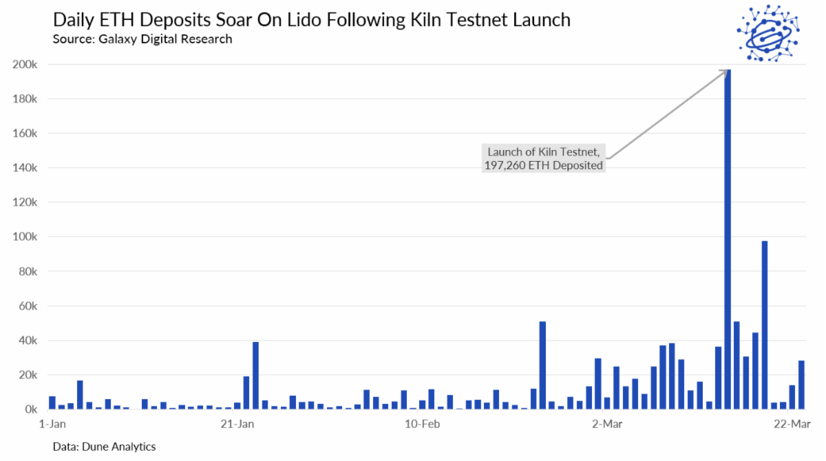 Daily deposits into liquid staking protocol Lido broke record highs as a result of the launch of Ethereum’s Merge testnet, Kiln. Since the launch last Tuesday, over 470,000 ETH, worth approximately $1.4 bn, has been deposited into Lido.