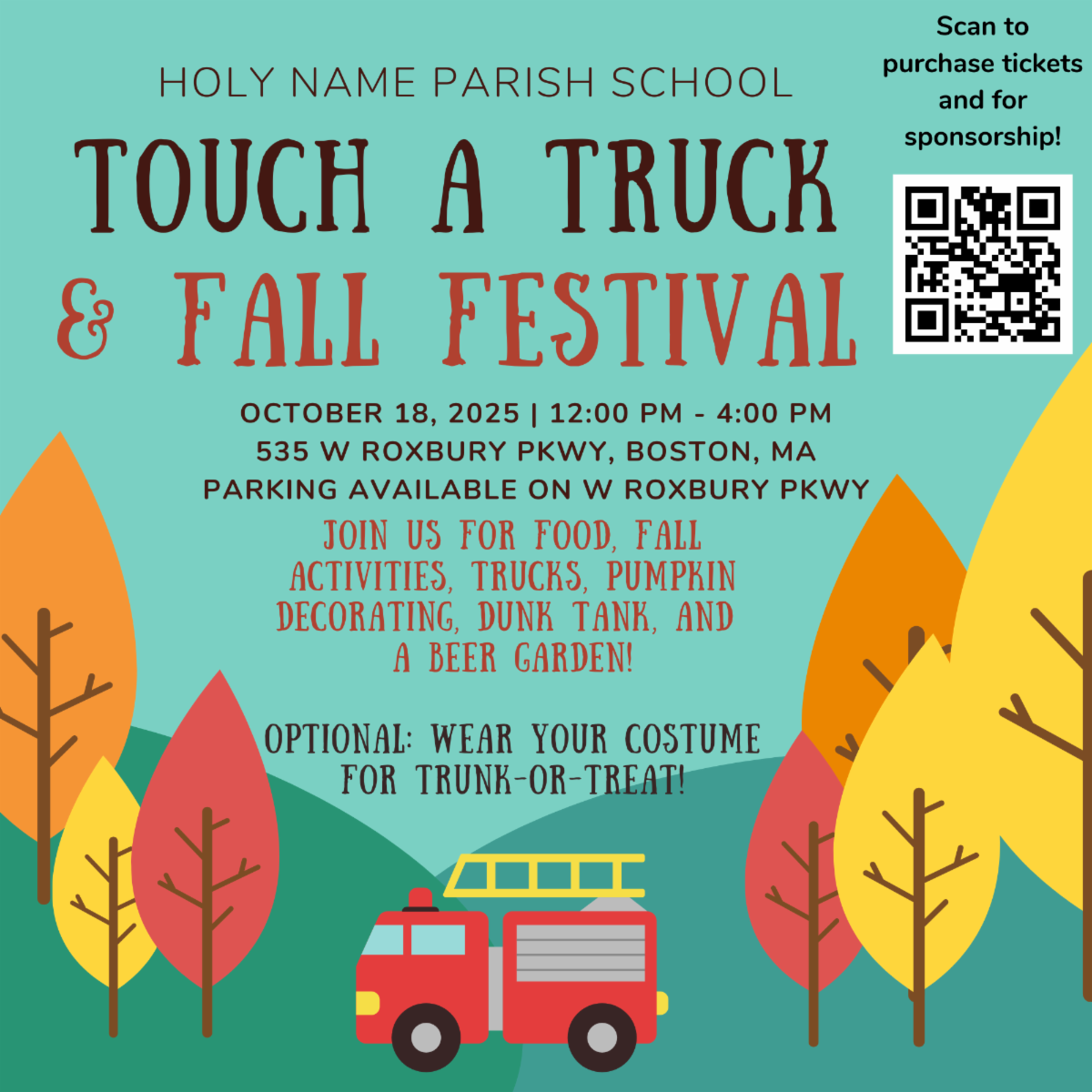 Join us for Holy Name Parish School’s Touch a Truck & Fall Festival on Saturday, October 18th (12p-4p) on the school campus! Buy your tickets online before they sell out. If you’d like to help before or during the event, sign up to volunteer here. There is still opportunity to sign up to volunteer, including 20-minute slots for the dunk tank!