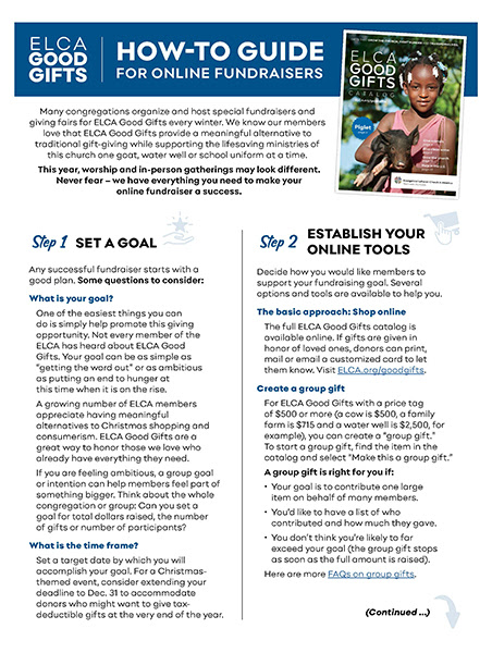 If you’re planning a congregation-wide fundraiser for ELCA Good Gifts and would like to track your giving as a group, be sure to take advantage of our new online tools ― like “wish lists” and “group gifts” ― to make collective giving a breeze. Learn more with our new how-to guide for online fundraisers.