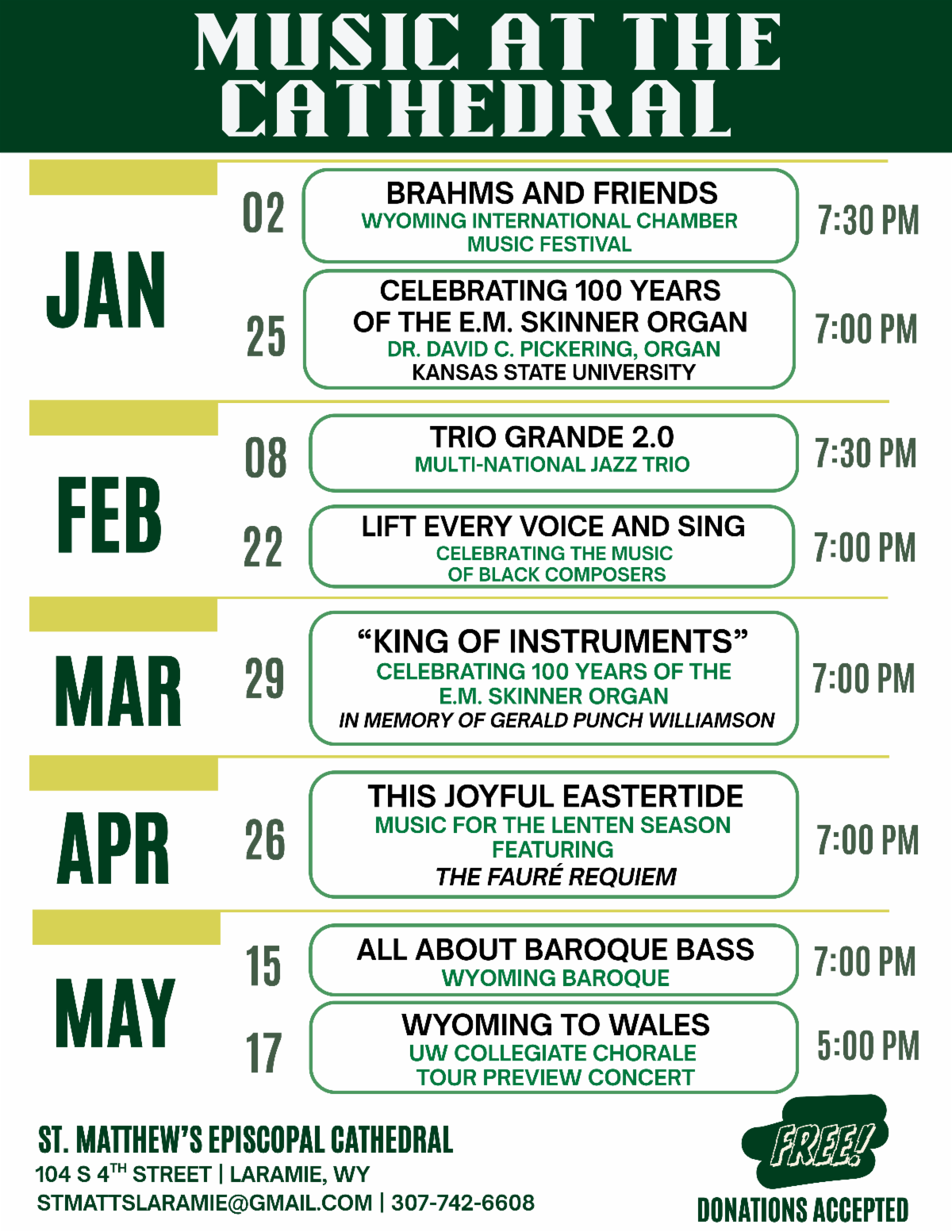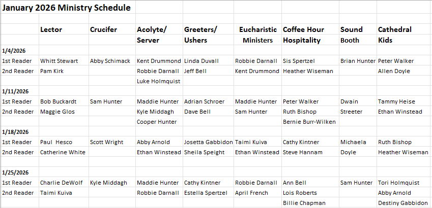 The annual meeting will take place in the undercroft on Sunday, January 25, immediately following the 10 a.m. worship service. The congregation will vote on a 2026 budget, which will be sent out before the meeting, as well as three new Diocesan Convention delegates (1-year term) and Vestry members (Senior Warden/Dean recommendation / 1-year term), Junior Warden (1-year term), and two regular Vestry positions (3-year terms).