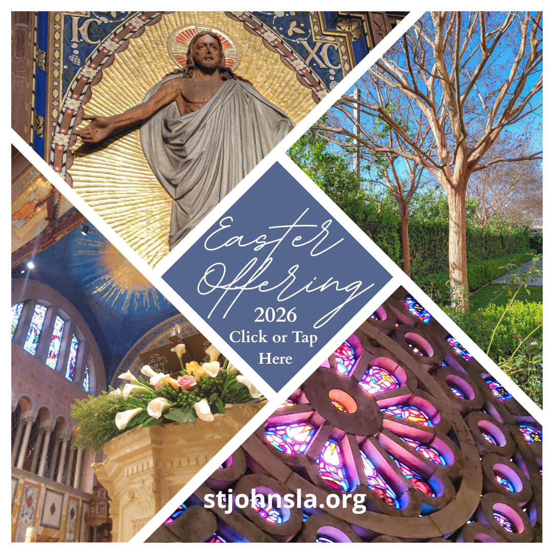 | | Holy Week and Easter 2026 at St. John's Cathedral, Los Angeles | | All are warmly invited to journey with us through the solemn beauty and profound hope of Holy Week at St. John’s Cathedral. At the heart of this sacred time is the Holy Triduum—the “Three Days” that span from the evening of Maundy Thursday through Good Friday and culminate in the Great Vigil of Easter on Holy Saturday. These liturgies form one continuous act of worship, drawing us into the mystery of Christ’s Last Supper, Passion, death, and Resurrection. We hope you will join us for these deeply moving services as we walk together from darkness into light. | | | | On Holy Saturday, April 4 at 7.00 p.m., we will celebrate the Great Vigil of Easter with the lighting of the Paschal Candle from the new fire, the chanting of the Great Litany, the telling of salvation history, the movement from darkness to light, a glorious baptism, and the presence of the Risen Christ. | | | | On Easter Sunday, April 5 at 10.00 a.m. there will be one joyful service at 10:00 a.m., featuring brass and timpani. The Rt. Rev. John Harvey Taylor will celebrate and preach. An Easter egg hunt will follow the service for our children, and the Easter Bunny is expected as well. Together, we will sing and rejoice in the Risen Lord — Christ among us, here and now. | | |