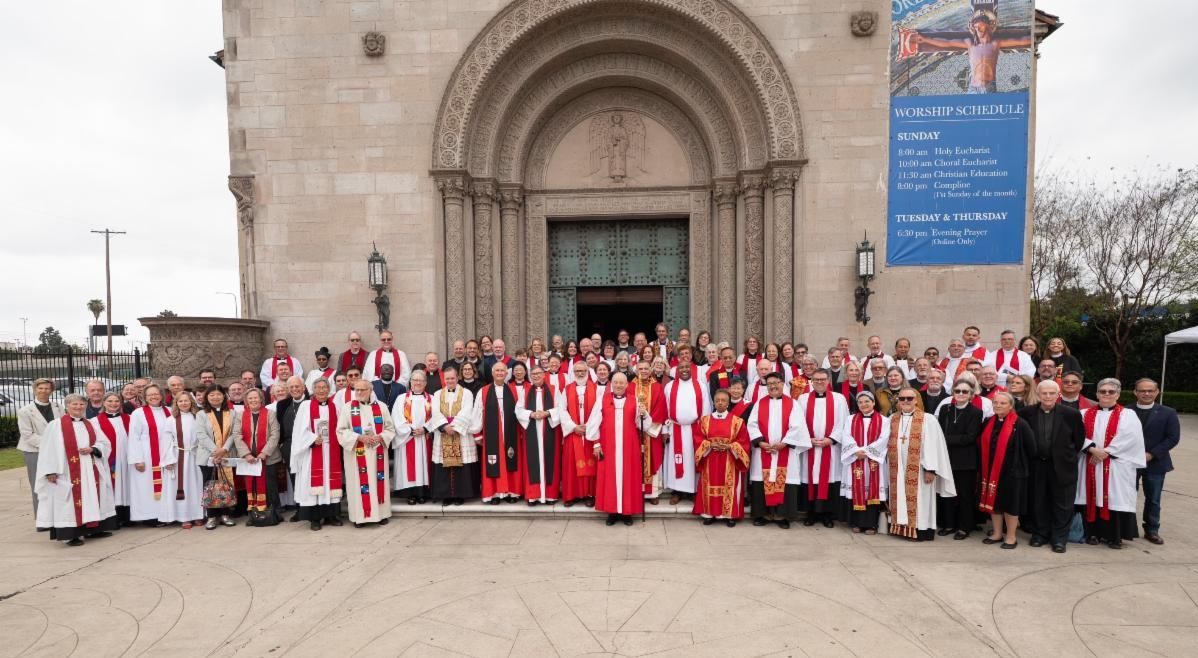[The Episcopal News] Nearly 100 clergy from across the Diocese of Los Angeles gathered at St. John's Cathedral March 31 for the annual Chrism Mass and renewal of vows service. Bishop-elect Antonio J. Gallardo L. celebrated the Eucharist, and Bishop John Harvey Taylor preached the homily. Cathedral Interim Dean Anne Sawyer welcomed all to the liturgy at which holy oils were blessed and distributed. Read more here. Watch video of service here.